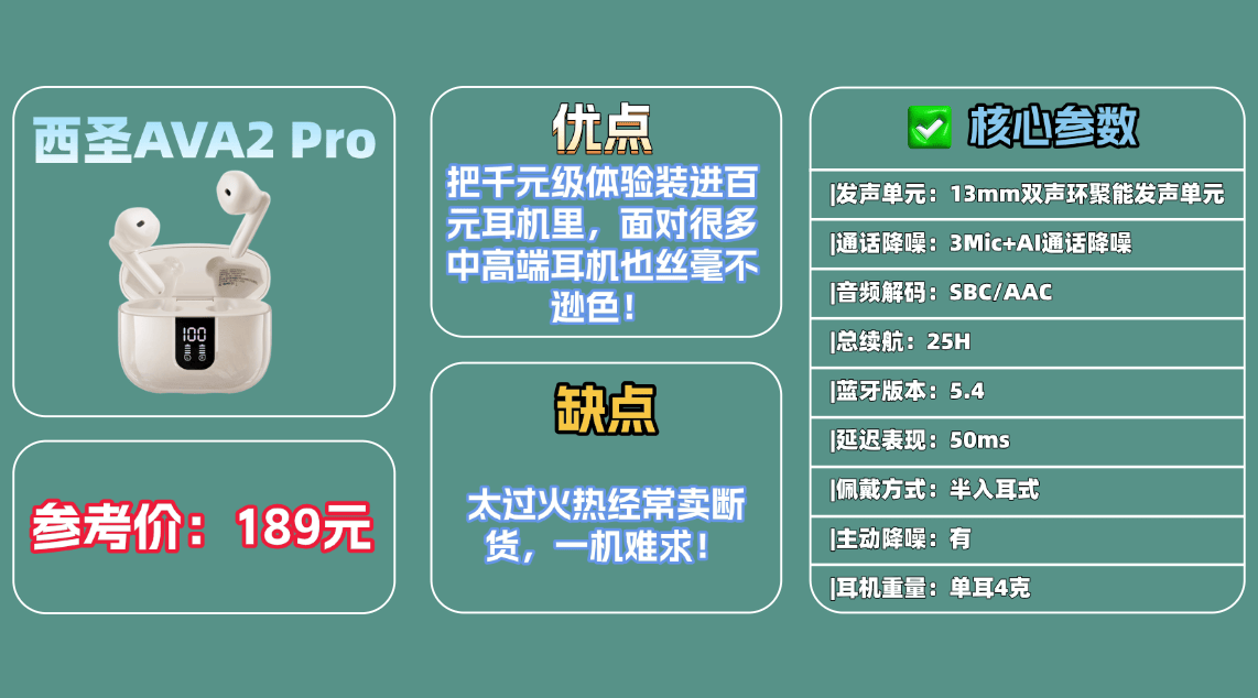 ① 追求高性价比+旗舰音质:西圣AVA2 Pro蓝牙耳机——舍弃花哨噱头,死磕连接稳定、音质扎实、佩戴舒适,平价也能拥有优质体验,花20%的价格就能享受到媲美千元耳机的顶尖音质!