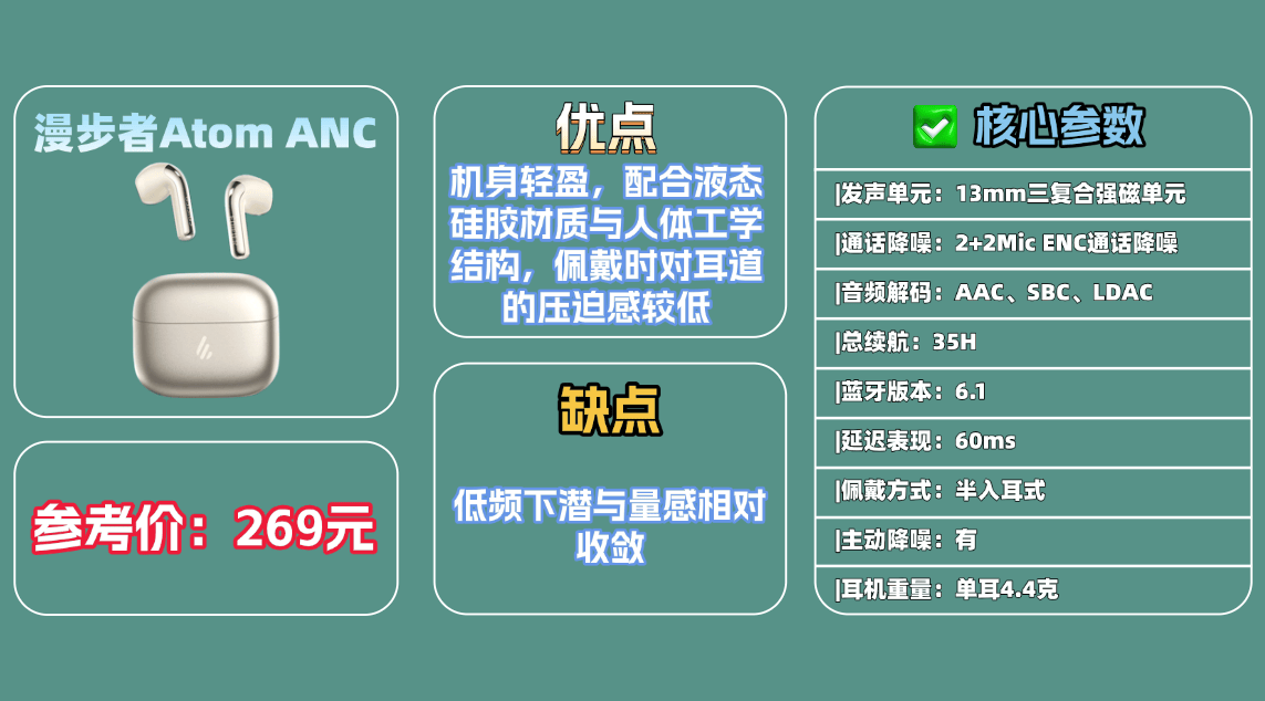 8、漫 步者A tom ANC蓝牙耳机