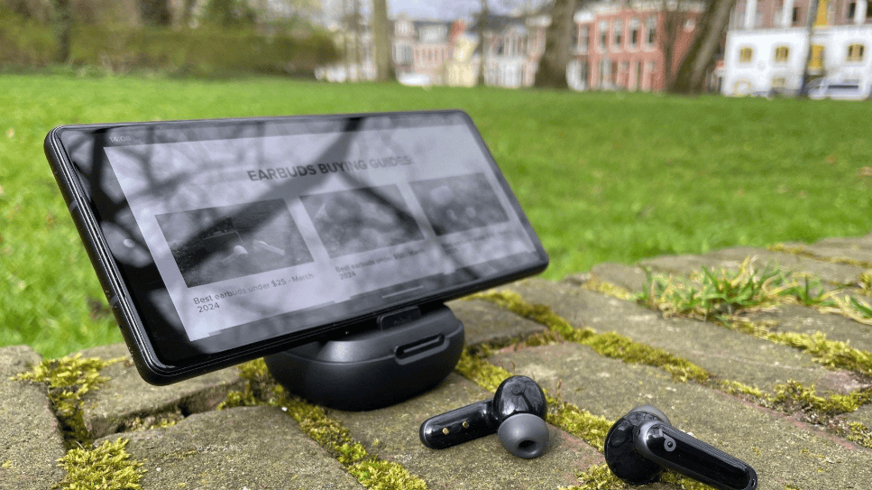 1:这款耳机整体比较小巧精致,同时还有手机支架设计,实用性比较强。降噪方面,它配备“前馈+后馈+通话”六麦克风阵列,并搭载自研AI降噪3.0芯片,实测中低频段噪音抑制明显。音质方面采用11mm羊毛纸复合振膜单元,搭配BassUp低频增强技术,低频下潜至20Hz澎湃有力,高频不刺激,中频偏温和,人声情感不够饱满。LDAC高清编解码支持24bit/96kHz无损传输,支持3D全景音效与游戏音效模式,可实现手游低延迟、声画同步体验,满足音乐与游戏双场景需求。