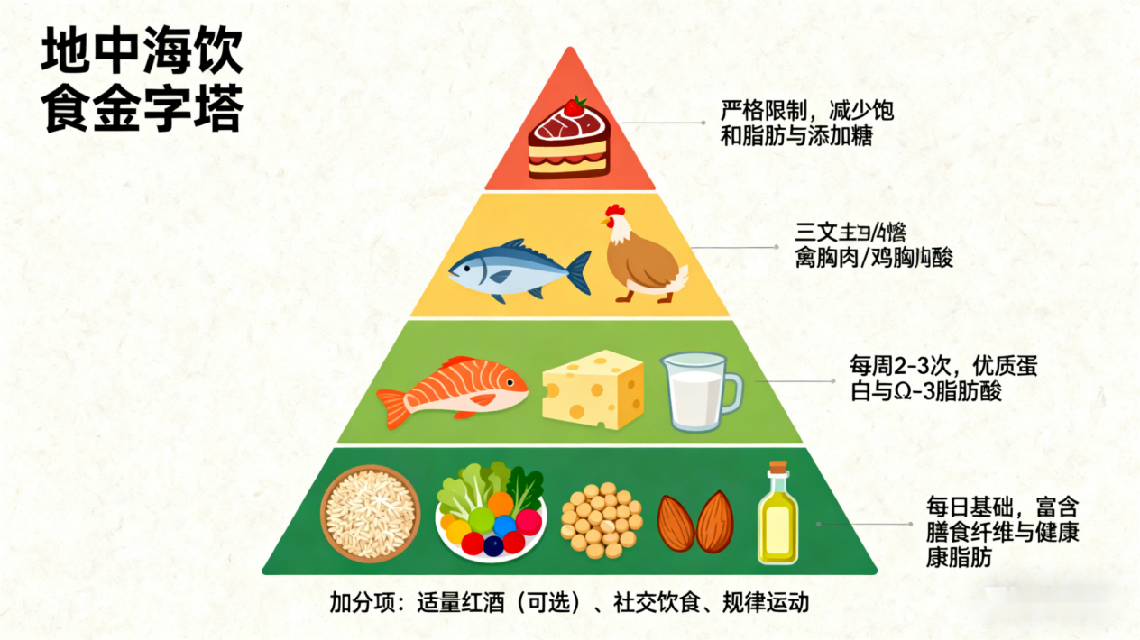采用地中海饮食模式,不是说让你彻底不吃中餐了。咱们可以学它的精华:炒菜多用橄榄油或菜籽油;让蔬菜水果在盘子里占大地方;主食里加点糙米、全麦这些粗粮;每周保证吃鱼;让红肉当“配角”;多吃点豆制品和坚果。