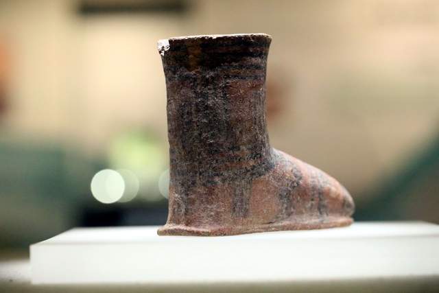 俯身细观,陶靴高11.4厘米,底长14.3厘米,靴筒圆润,口部微敞,中空的造型与现代短靴别无二致。靴帮与鞋底衔接处内凹设计,前尖后方,行走时稳稳当当,尽显古人的生活智慧。最令人称奇的是其装饰与工艺:紫红色陶衣为底,对称的双线回纹、带纹与三角纹交错点缀,配色竟与当下流行的“美拉德风”不谋而合,让人不禁感叹“时尚果然是个轮回”。更难得的是,它采用“帮底分件”技术制作,左右对称无分脚设计,穿坏一侧后可调换左右脚继续使用,堪称最早的“可持续时尚”。这双小小的陶靴,不仅见证了青海河湟地区早期文明的繁荣,更以精湛的制陶工艺与独特的审美追求,诉说着远古先民对美好生活的向往,为研究古代手工业、鞋靴文化及民族服饰演变提供了珍贵的实物资料。