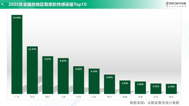 360统计发现,2025年勒索软件攻击的地域分布保持稳定,仍集中在数字经济发达及人口密集地区。广东、北京、浙江位列受影响程度前三,这说明发达区域持续面临更高威胁。