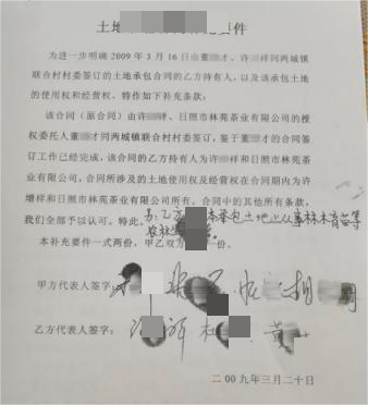 程序违规的30年承包合同,前任过错为何要现任村民买单?2009年3月,联合村时任部分村委成员与非本村村民董某才、许某祥签订《土地承包合同》,将村集体103亩山场发包给二人用于茶园建设,而这山场在此之前是村民的口粮地、基本农田。合同承包期限长达30年,承包费仅为200元/亩/年,分三次缴纳。合同签订仅4天后,双方又签订补充要件,允许承包方从事林木育苗等经营活动,而这份补充要件未加盖村委公章且存在部分村委成员未在场却被代签的明显瑕疵。