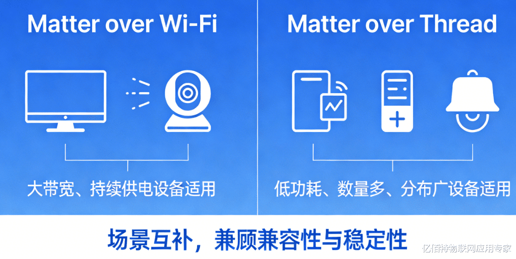 对于智能电视、监控摄像头这种需要大带宽、持续供电的设备,Matter over Wi-Fi 是合理的选择。