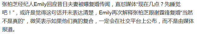当时张柏芝的经纪人emily正在直播,脸上还带着微笑,在得知大家的问题后,经纪人微笑着和大家开玩笑:先睡吧,这似真似假的答案让大家很摸不清头脑,所以没过一会,经纪人又面带微笑的回应了一遍,称这件事不是真的。