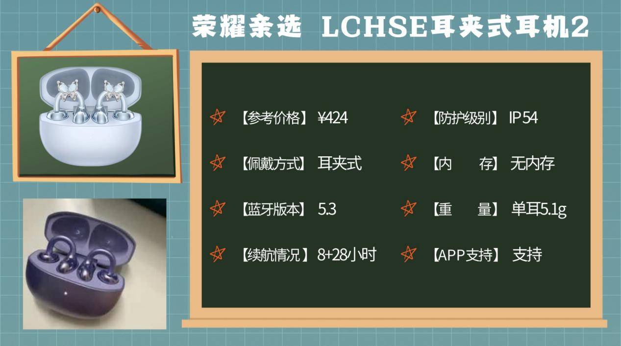 荣耀在耳机市场定位为时尚与科技结合的智能配件品牌,在轻量舒适和日常佩戴耳机方面有一定经验。LCHSE耳夹式耳机2在品牌中属于轻巧时尚型产品,强调长时间佩戴舒适、设计精致,同时兼顾续航与基本防水。