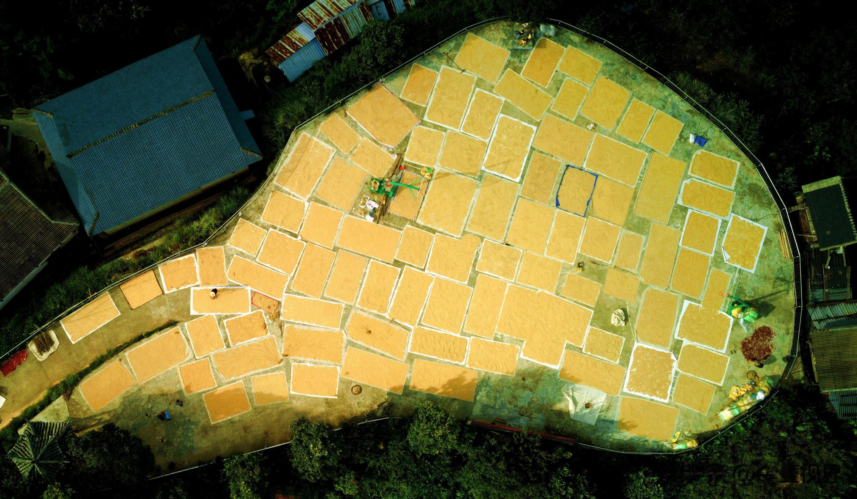 在贵州省黔东南苗族侗族自治州从江县东朗镇摆啊村,农民正在晾晒辣椒(无人机照片)。