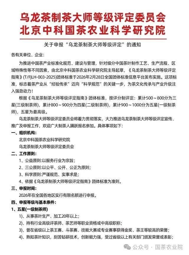 为推进中国茶产业标准化规范、建设与管理,针对细分中国茶叶制作工艺、生产流程、区域特殊性等不同因素,由北京中科国茶农业科学研究院主导起草,《乌龙茶制茶大师等级评定指南》(T/FJLH-003-2025)团体标准于2026年2月28日全国团体标准信息平台发布。这一标准的落地,意味着乌龙茶制茶技艺将从传统的“经验传承”逐步转向“科学规范”的评价体系,为行业人才评定提供权威依据。