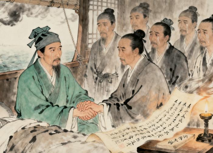王阳明轻轻唤着贴身弟子周积的名字,声音微弱却清晰。周积连忙快步走到榻边,俯身握住师父冰凉的手,眼眶通红地应道:“先生,弟子在。”