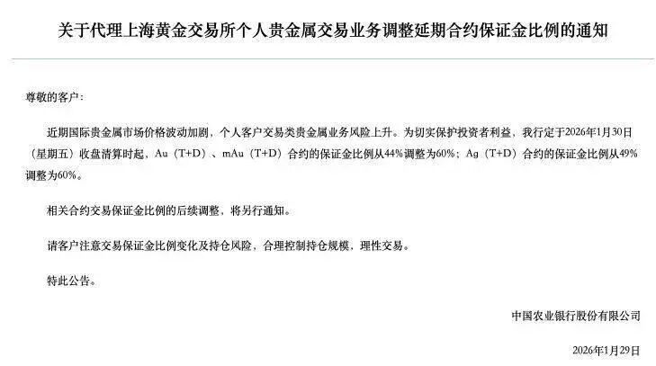 工商银行2月1日,工商银行通过公司贵金属业务部“工银金行家”公众号发布风险提示。近期国内外贵金属价格波动剧烈,市场不确定性显著增强,工行建议客户在审慎评估自身风险承受能力的基础上,保持理性投资心态,避免盲目追涨杀跌。公告建议客户从中长期视角考虑,坚持分批分散、适度均衡的原则进行投资配置,同时密切关注行情变化,合理控制持仓规模,有效防范市场波动风险。此前,1月30日,工商银行官网发布公告,自2月7日起,工行对如意金积存业务及浮动报价类实物黄金产品销售业务的办理时间进行调整;在周末以及法定节假日等非上海黄金交易所交易日,对如意金积存业务进行限额管理并进行动态设置。农业银行1月29日,农业银行发布《关于代理上海黄金交易所个人贵金属交易业务调整延期合约保证金比例的通知》,于1月30日收盘清算时起,Au(T+D)、mAu(T+D)(迷你黄金延期交收合约)合约的保证金比例从44%调整为60%。同时,农行请客户注意交易保证金比例变化及持仓风险,合理控制持仓规模,理性交易。