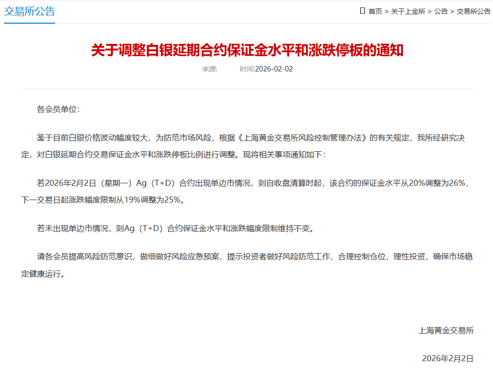 若2026年2月2日(星期一)Ag(T+D)合约(白银延期交收合约)出现单边市情况,则自收盘清算时起,该合约的保证金水平从20%调整为26%,下一交易日起涨跌幅度限制从19%调整为25%。