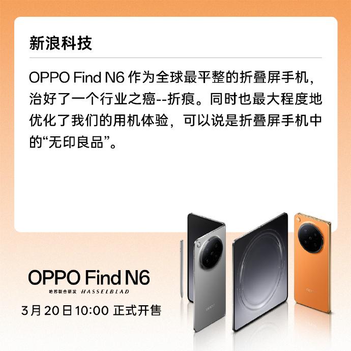 OPPO Find N6 的热销,并非偶然,而是国产折叠屏八年技术沉淀的必然结果。这款机型不堆参数、不玩噱头,用实打实的体验征服了市场,也让国产折叠屏彻底站稳了高端市场。3 月 20 日 10:00,OPPO Find N6 已正式开售,目前各大电商平台搜索OPPO Find N6即可下单,购机可享至高 24 期免息,全品牌折叠屏老用户以旧换新至高补贴 1400 元,首销期间更有至高价值 399 元限量礼赠,想要入手的朋友可别错过这波首发福利!