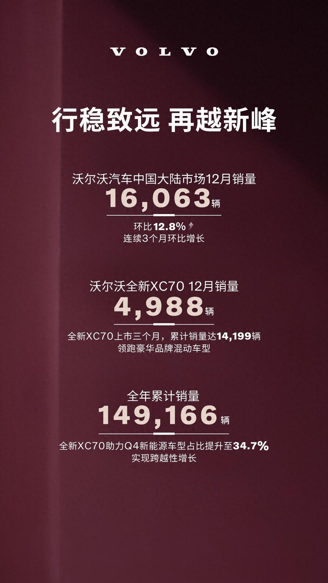 近日,沃尔沃汽车公布了2025年12月的销售数据,中国大陆市场单月销量达到16,063辆,环比增长12.8%,全年累计销量突破149,166辆。面对豪华车市场日益激烈的竞争,这一成绩展现了沃尔沃的稳健步伐和在消费者中的稳定吸引力。