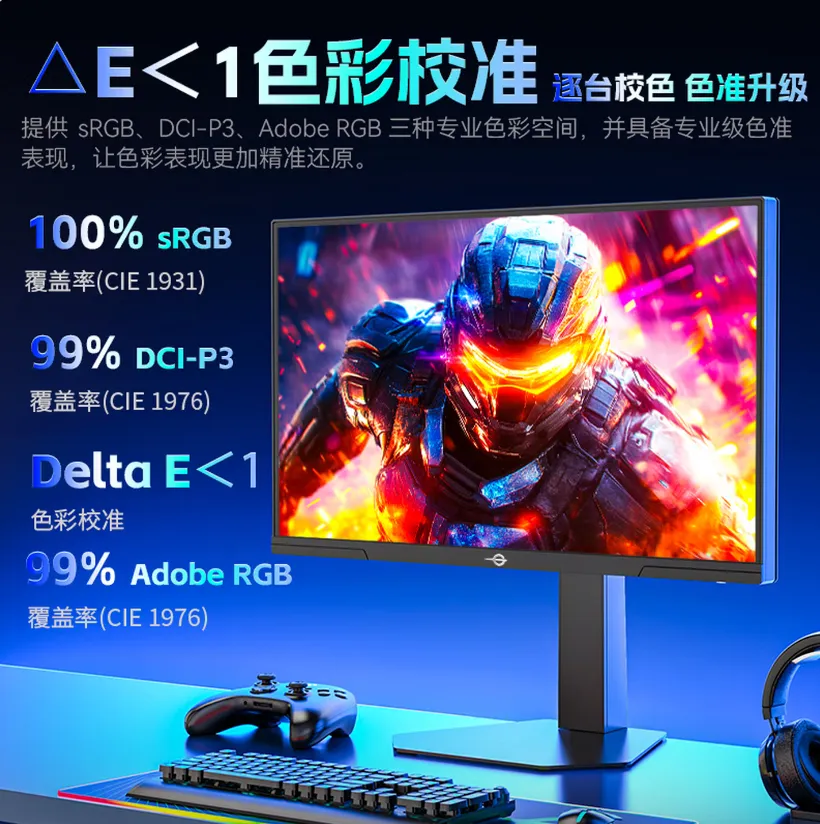 P245MS PRO的sRGB色域容积高达154%,三种色域标准下的色域覆盖则可达到100% sRGB,以及99%的DCI-P3和Adobo RGB,每一台屏幕均经过出厂校色,可获得△E<1的专业级色准,游戏之余也能满足工作室级别的图像影视创作。