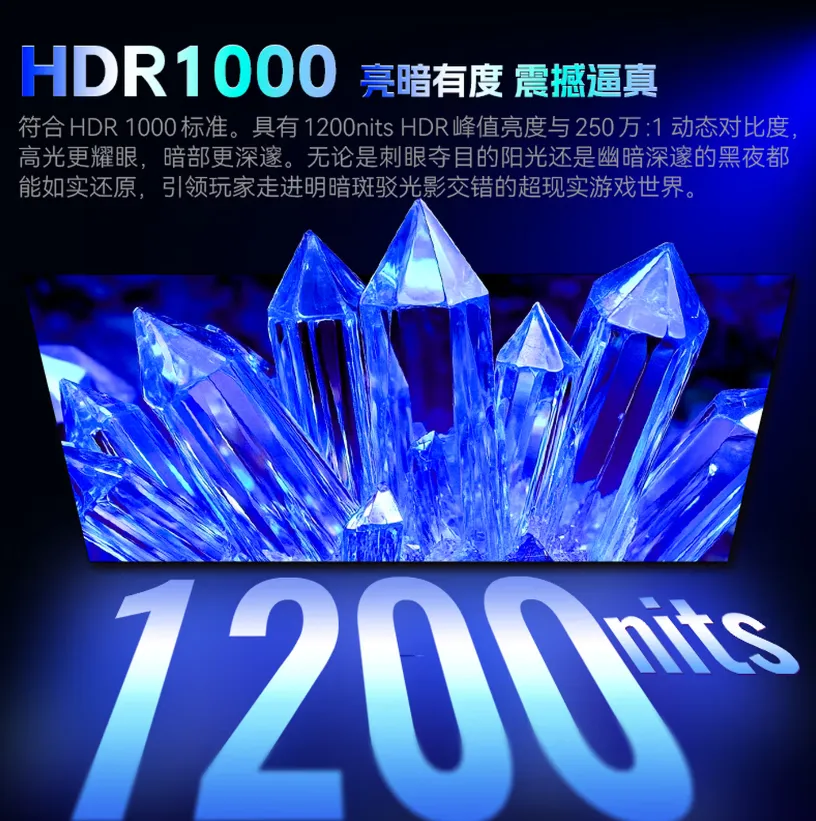 这块屏幕还符合HDR1000,(HDR下)1200尼特的峰值亮度与250万比1的动态对比度,可以让黑色部分更深邃,白色部分更明亮,结合高达380Hz的超高刷新率(原生360Hz,380Hz为超频模式)和1ms灰阶响应时间,可以让玩家更加沉浸在明暗斑驳、光影交错的超现实游戏世界。