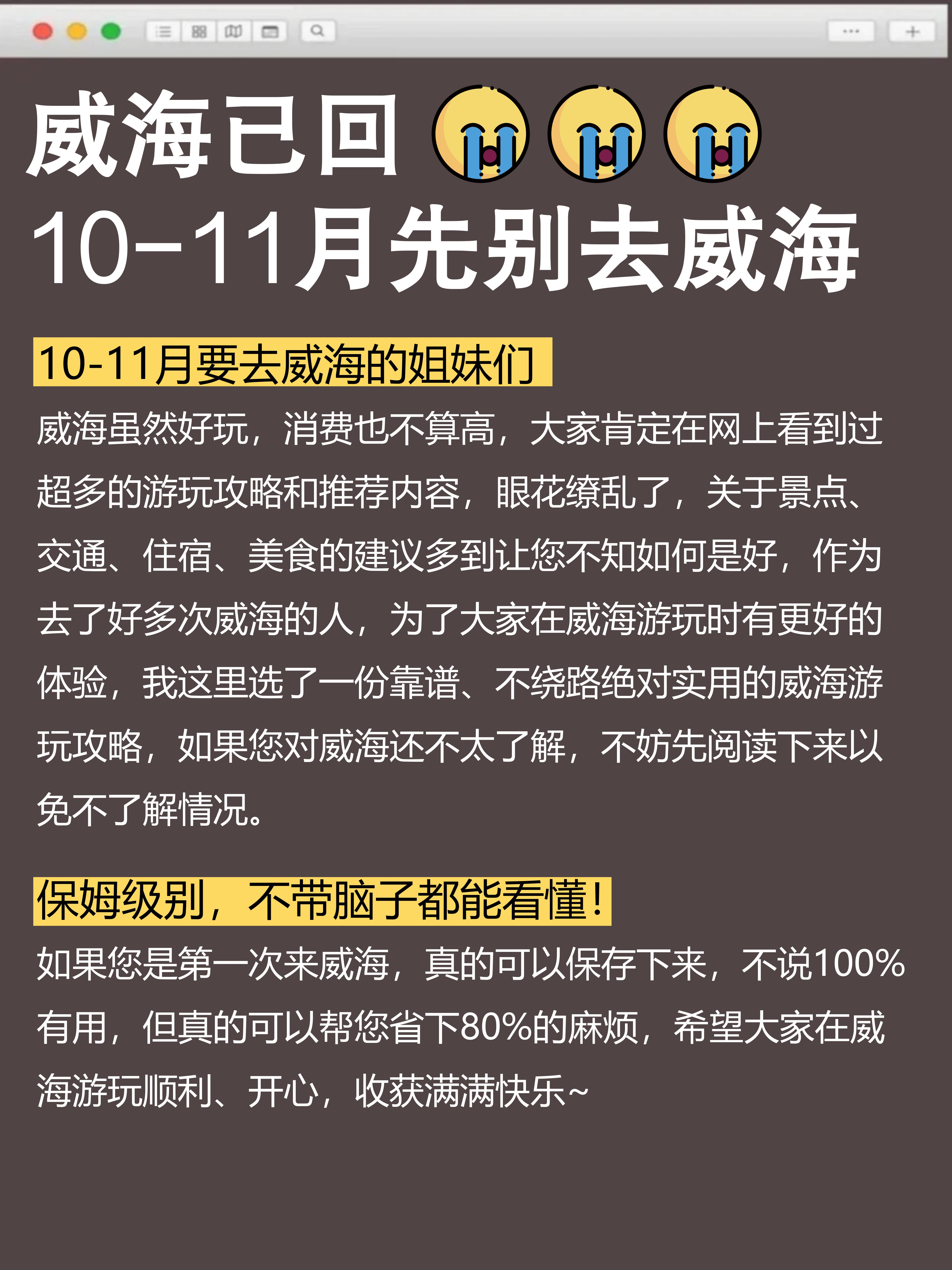 第一次来威海的姐妹们👭,记得要做好攻略再来威海,威海真的不适合临时起意😞,下面是我整理的威海旅游攻略,真的很实用~分享给姐妹们,希望大家能在威海玩得开心~