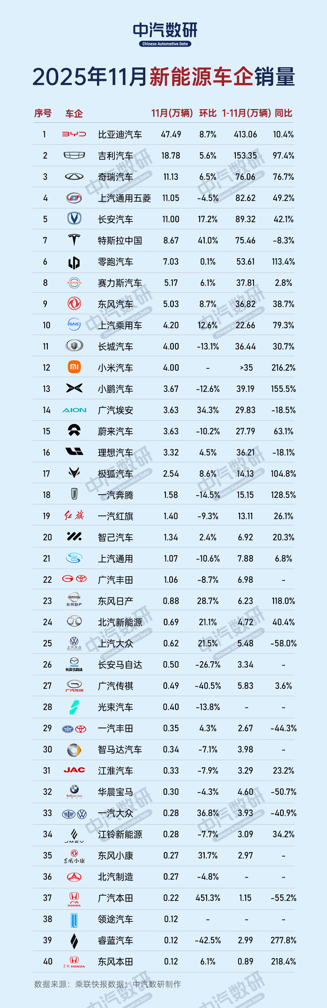 11月新能源汽车销量排名前三的车企分别为:比亚迪汽车,47.5万辆,环比增长8.7%;吉利汽车,18.7万辆,环比增长5.6%;奇瑞汽车,11.1万辆,环比增长6.5%。