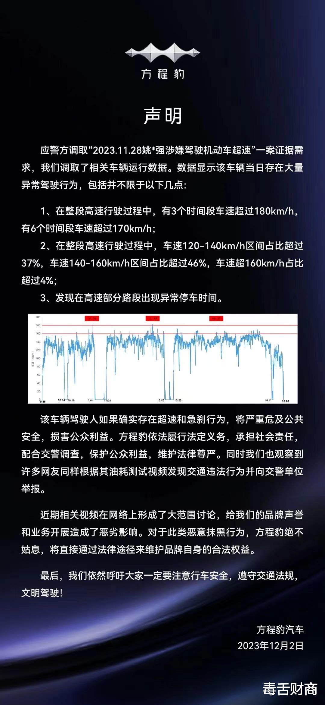 那为什么这位车主会得出如此高的油耗呢?后来经过比亚迪核查才发现,他在三个时间段存在车速超过180公里每小时,另外有6个时间段时速超过170公里每小时,而在整段高速公路行驶过程当中,车速在120公里到140公里区间的占比超过37%,车速在140公里到160公里每小时之间占比超过46%,车速超过160公里每小时的占比超过4%。