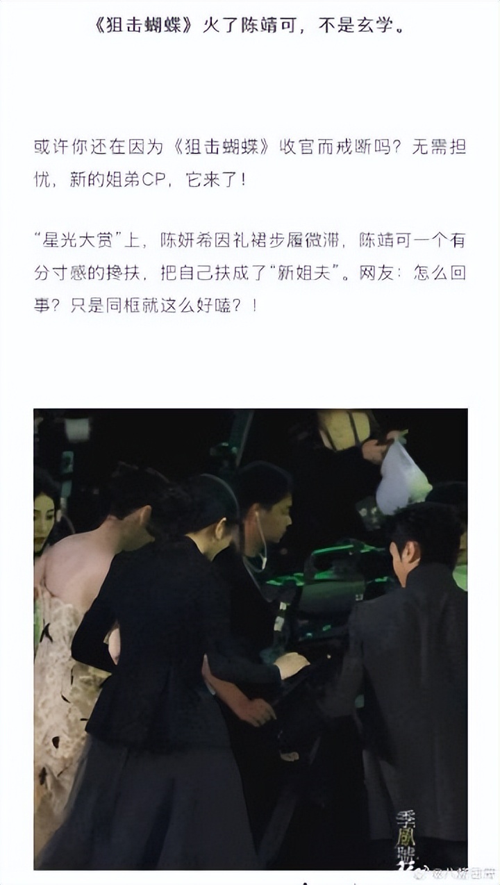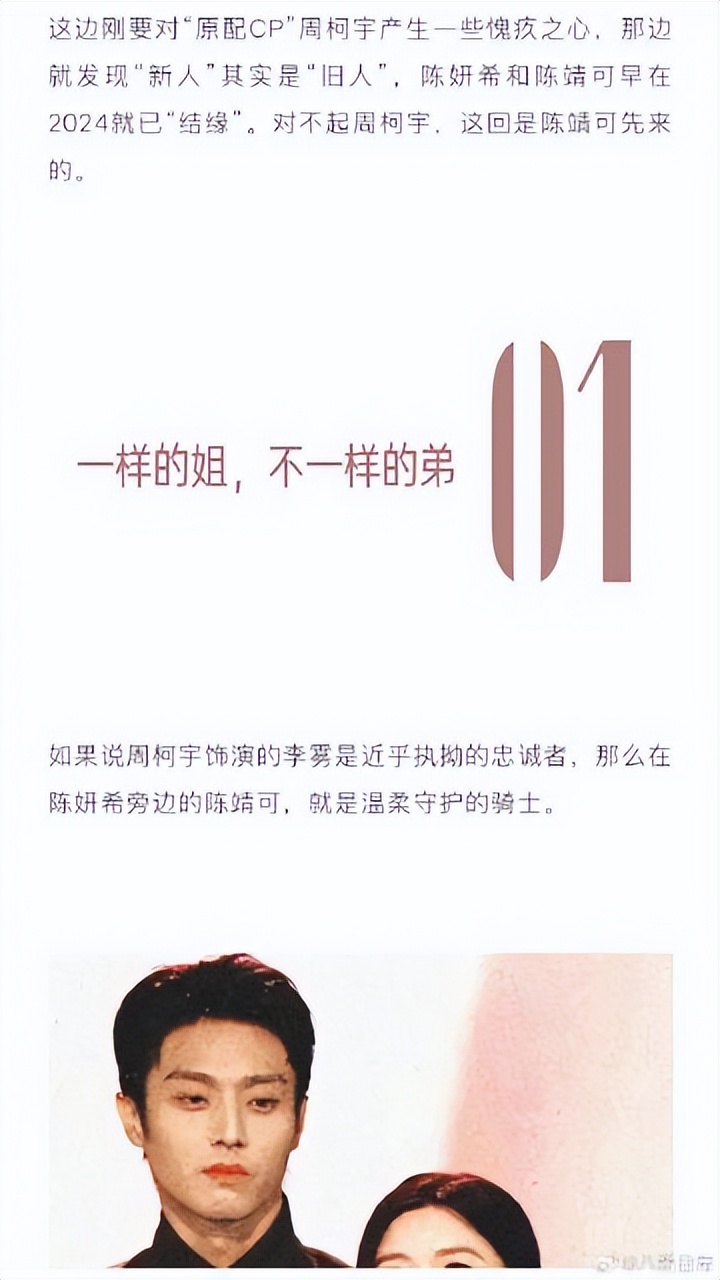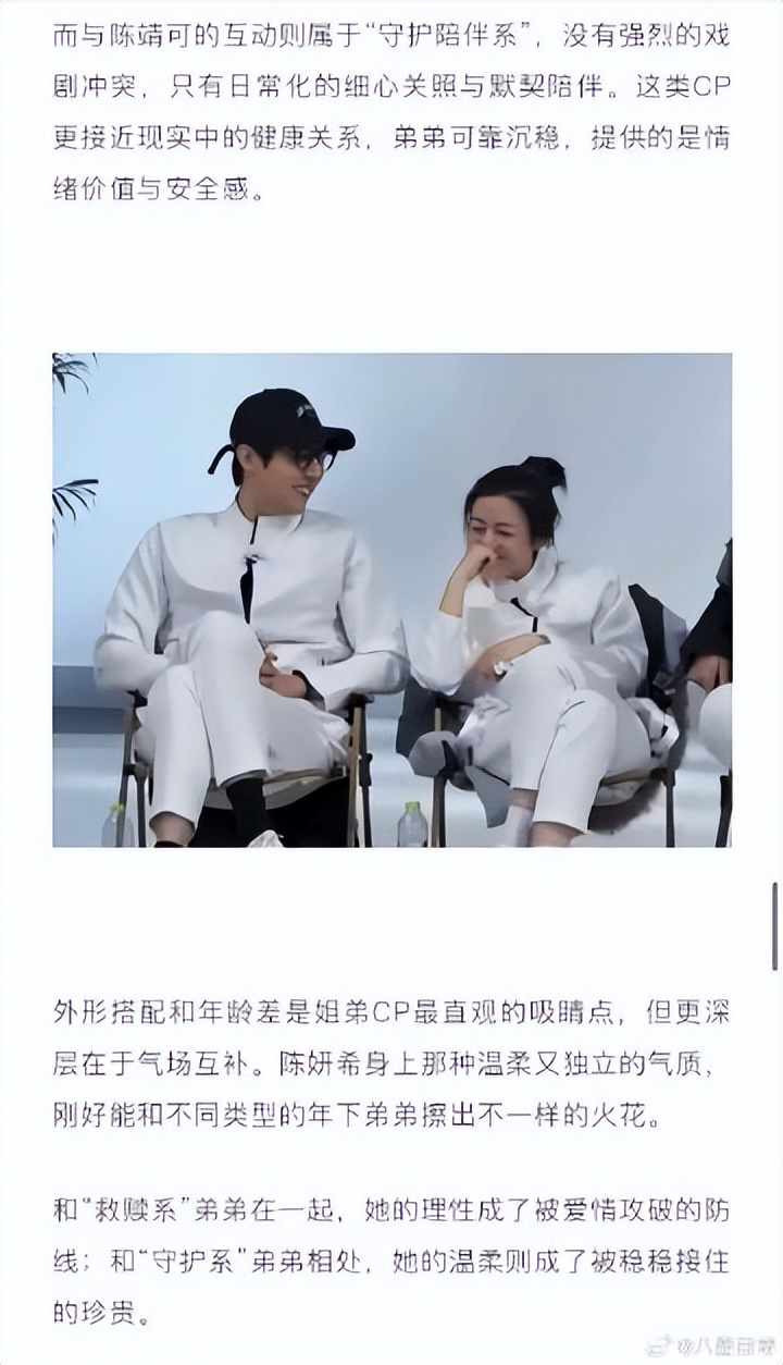 因此,星光大赏上的互动,更像是老友重逢的自然流露。相比之下,陈妍希与周柯宇在《狙击蝴蝶》中是极具张力的“救赎养成系”姐弟恋,而与陈靖可则是更贴近现实的“守护陪伴系”。两种不同的关系模式,满足了观众对姐弟CP的多样想象。