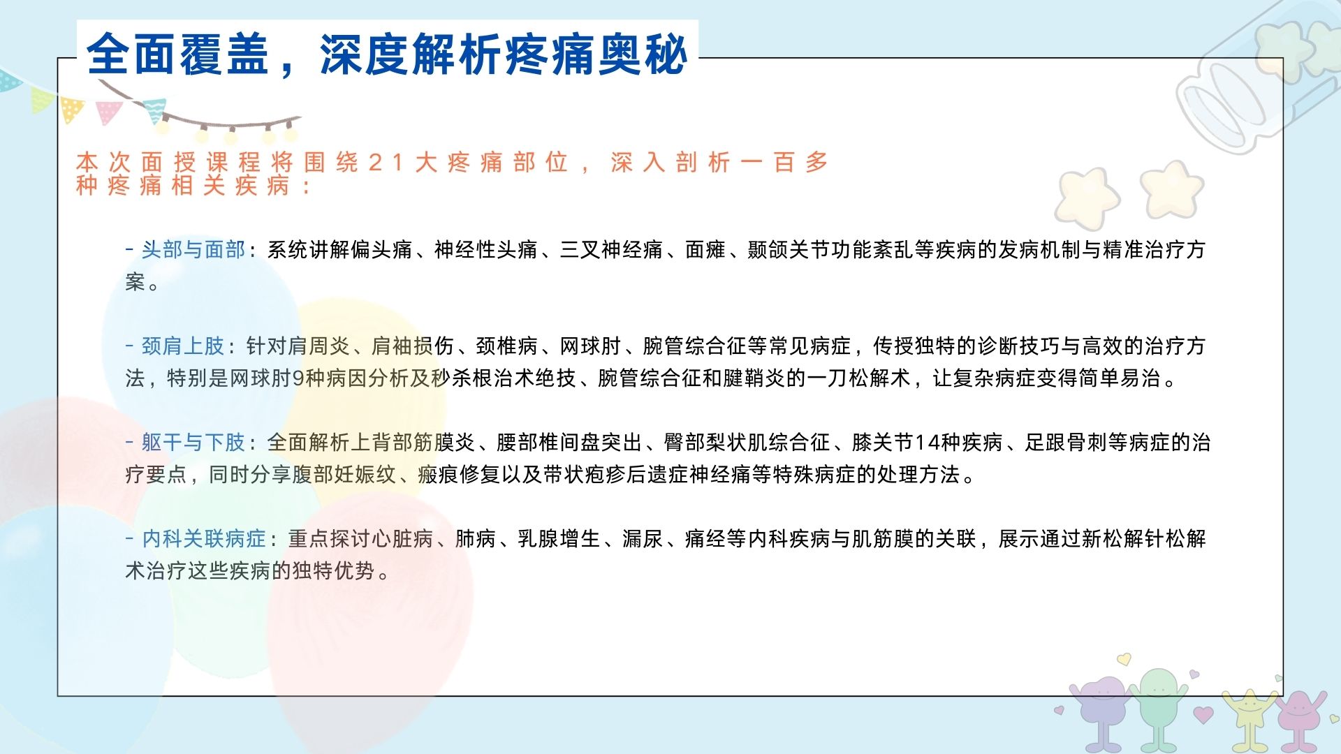 本次面授课程将围绕21大疼痛部位,深入剖析一百多种疼痛相关疾病: