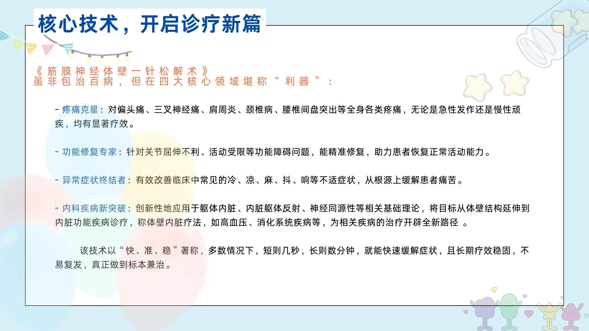 《筋膜神经体壁一针松解术》虽非包治百病,但在四大核心领域堪称“利器”: