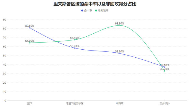 在篮下、非篮下三秒区、中距离以及三分线外,里夫斯各区域的命中率都达到了联盟的合格以及优秀水准,并且三分线内的非助攻率更高也意味着他有着更多的不依赖队友助攻的自主持球单打得分;
