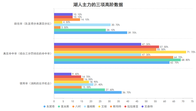 原本詹姆斯可以承担这样的任务,但詹姆斯随着年龄老化终结能力肉眼可见的下降,而里夫斯在使用率、真实命中率以及助攻率三项表现没有达到队内最高但却能同时达到较高的水准,这意味着他消耗的出手机会、结合三分罚球后的得分效率以及队友受他助攻的得分占比都同时在线,由他来开发的持球大核体系同样强力。