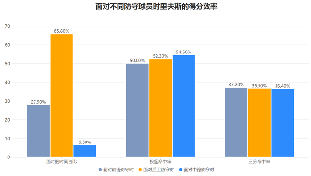 面对后卫、前锋以及中锋这三种不同位置的防守球员时,里夫斯的投篮以及三分命中率并无太大的起伏,这意味着无论面对的防守球员是何种体型,他都能通过自己的各种技巧完成稳定的得分,不会被对手球员的高矮快慢所干扰;