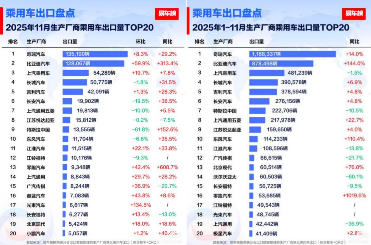 据易车数据显示,2025年11月,比亚迪乘用车出口量达到12.8万台,同比增长313.4%;今年1-11月累计出口87.8万台,同比增长144%,较2024全年总出口量已实现翻倍式增长,比亚迪成为中国出口增速最快的车企之一。