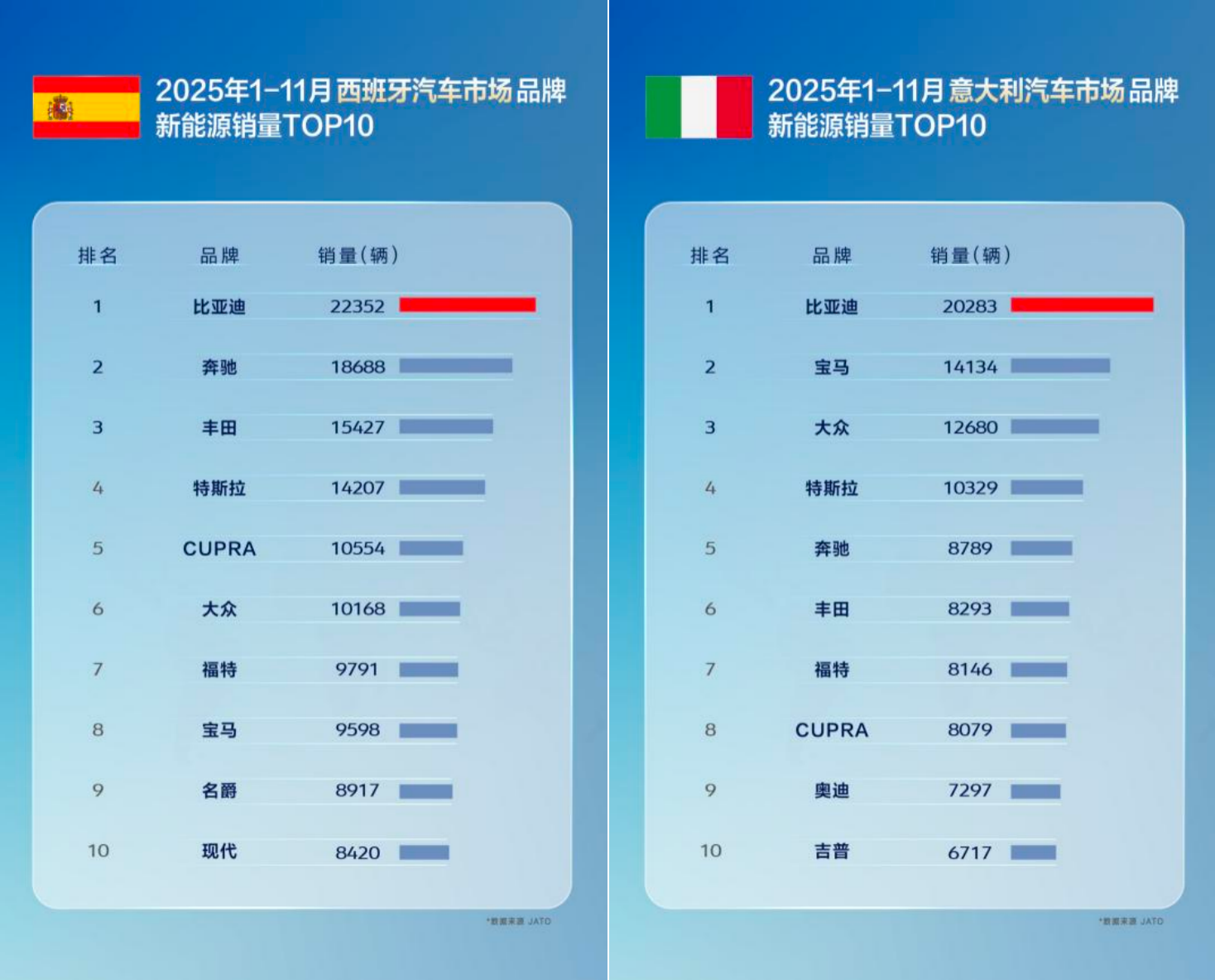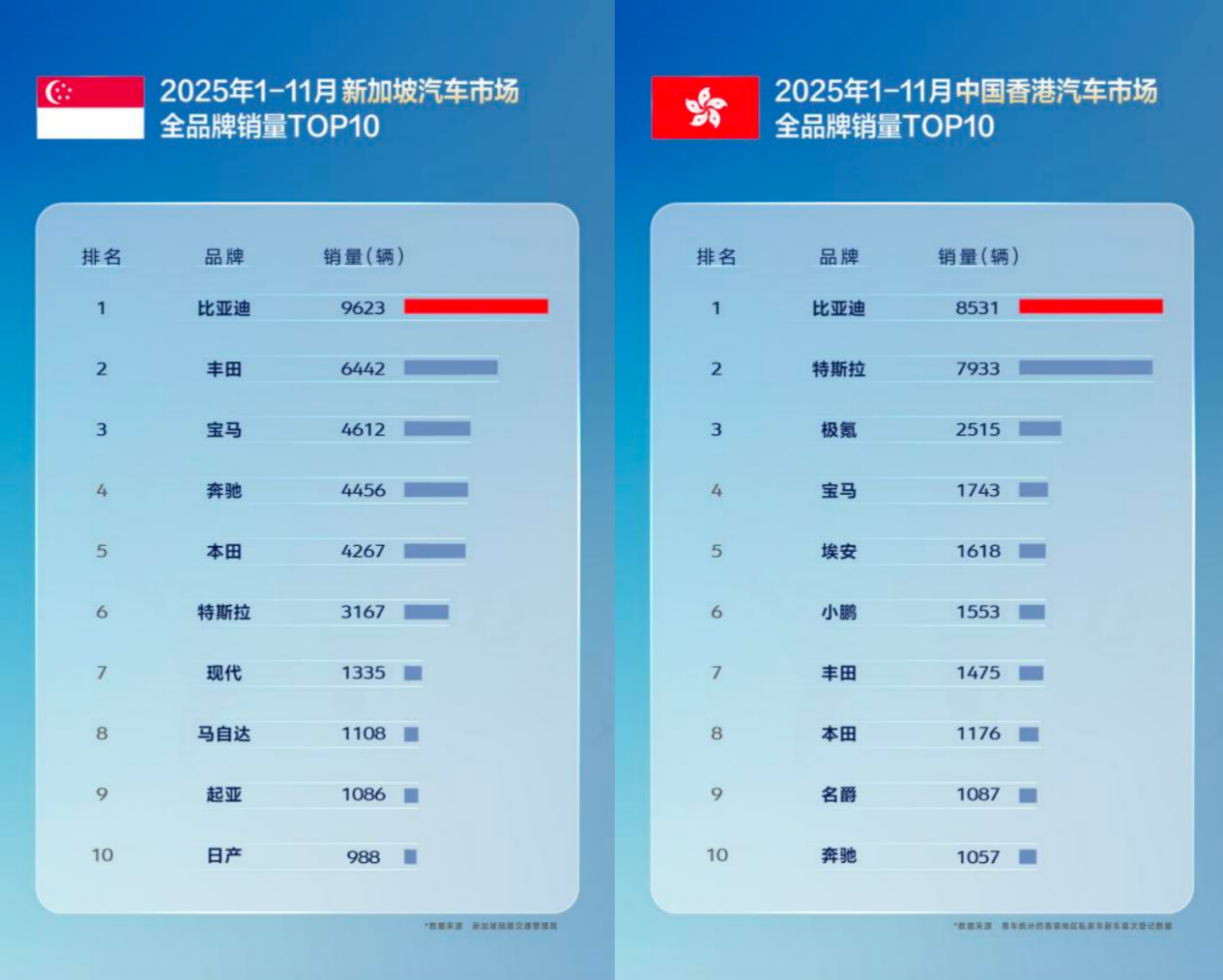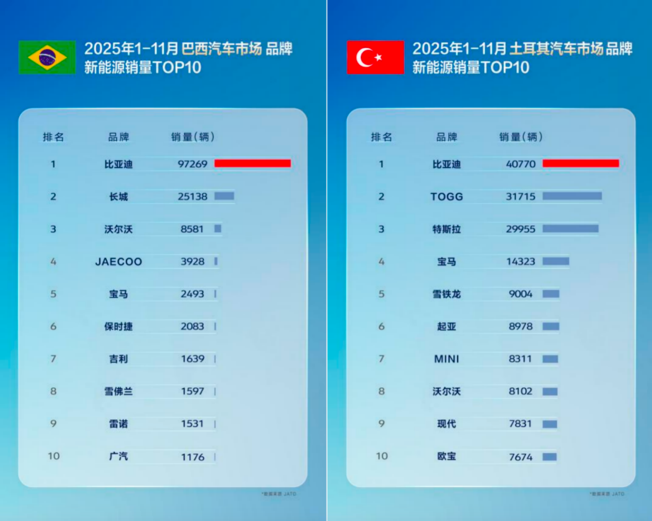 11月,比亚迪在巴西、土耳其、意大利、西班牙、匈牙利、克罗地亚等国拿下了新能源汽车销量第一,在新加坡等国家获得全品牌销冠。1-11月累计表现同样不俗,在巴西、土耳其、西班牙、意大利等国,比亚迪位列新能源汽车品牌销量榜首,获得多个国家消费者认可;在新加坡、中国香港等地区市场荣膺全品牌销量第一。