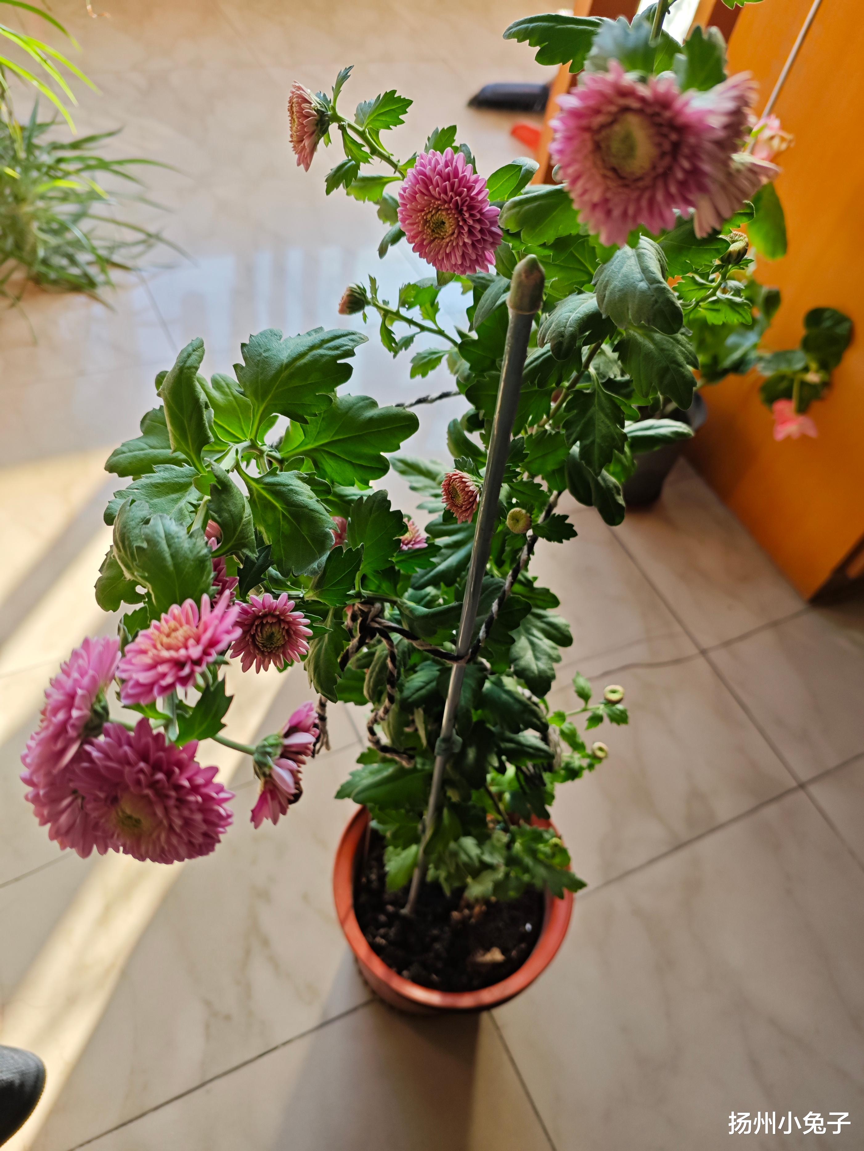 这盆菊花,于今年初夏季节来到我家。其实当时一起被我搬到楼上的,是两盆。两盆花皆是老大姐春天为我扦插。这盆稍大,另一盆小一点。