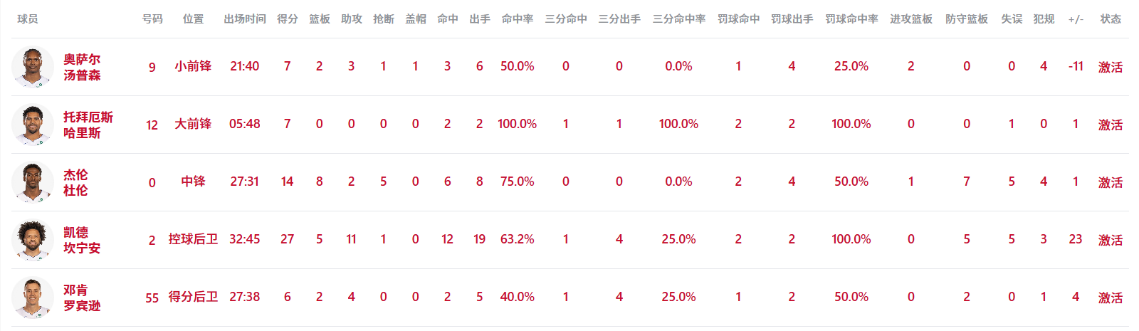 数据上,湖人队东契奇一人得分30分和11个助攻上双,活塞队与之对抗的坎宁安收获27分!从本赛赛后来分析,湖人队的战败与里夫斯受伤缺席有极大的关系!