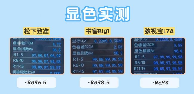 书客Big1的显色指数为Ra98.5,色彩层次自然、过渡细腻,配合SDCM<3的色容差控制,在阅读和彩色内容识别上非常接近日光状态。松下致准的显色为Ra96.5,属于稳定、可靠的水平,日常阅读完全没有问题,但在高饱和色的层次表现上略逊一筹。孩视宝L7A的显色为Ra98,在数值上表现不错,但受限于直发光光学结构,实际观感上仍存在一定亮度集中感。