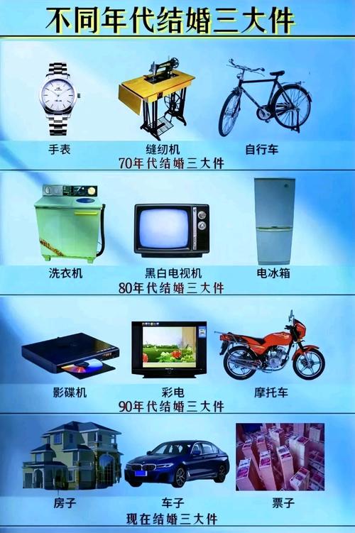 那个年代要求的是三大件,即缝纫机、手表、自行车有这些东西就达到了结婚的要求了,而现在要求的是车子、房子、票子,还要有一个年轻的婆婆,可以带孩子,彩礼、五金等才达到要求。