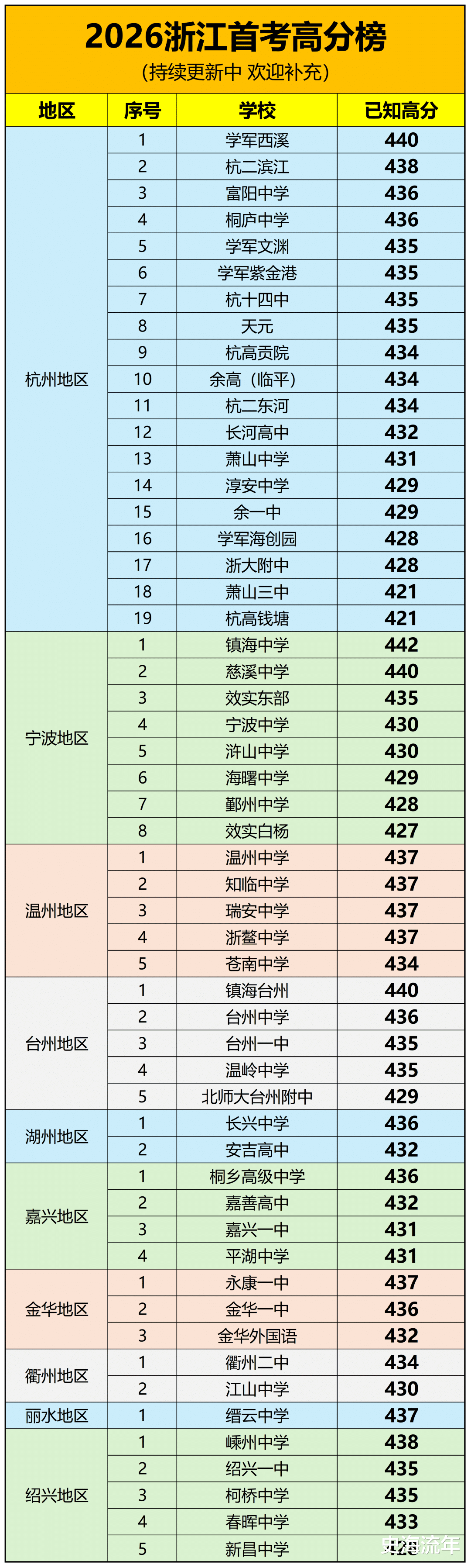 其他地市也有亮眼表现,如绍兴嵊州中学最高分438分,金华永康一中437分,衢州二中434分,湖州长兴中学436分,嘉兴桐乡高级中学436分,丽水缙云中学437分。温州育英实验学校最高分为435分。这反映出高分段考生分布虽仍向传统名校集中,但各地市均有顶尖学生脱颖而出。