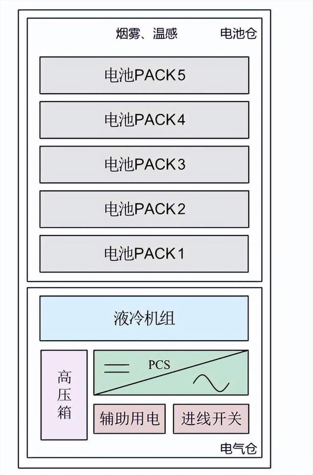 储能系统分为电池舱和电气舱,双舱分离设计。电池舱位于柜顶,装有 5 组电池 PACK。电气舱位于柜底,装有液冷机组、储能变流器、高压箱、辅助用电和进线开关等。