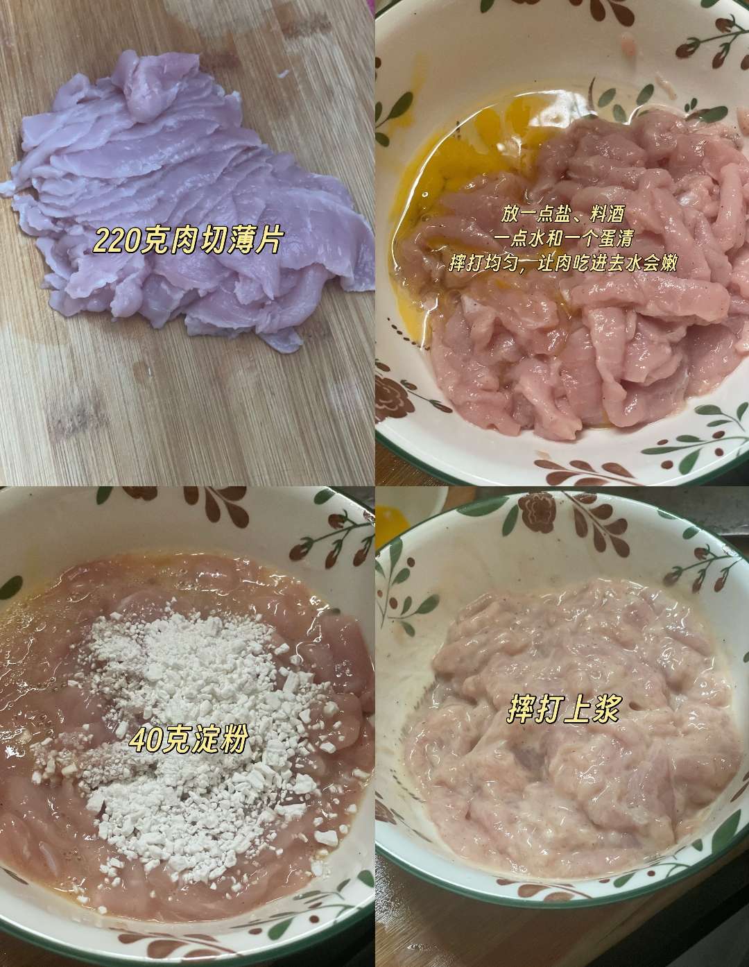 制作一道正宗的过油肉,始于对肉片的精心“侍弄”。选取猪里脊或扁担肉,剔除筋膜,横纹片成约0.33厘米厚的均匀薄片,这是保证口感嫩滑的基础。肉片需进行深度的腌制与上浆,这是嫩滑不柴的关键。传统做法会加入黄酱、花椒水、酱油和盐进行长时间腌渍,使味道充分渗透。家庭简易版则常用盐、陈醋抓拌至粘手,再打入鸡蛋、加入淀粉上浆,最后用油封住水分,静置片刻。其中,花椒水是山西菜的灵魂调味,能有效去腥增香。上浆的目的是让肉片在油炸时舒展膨胀,锁住内部汁水,变得香嫩顺滑。