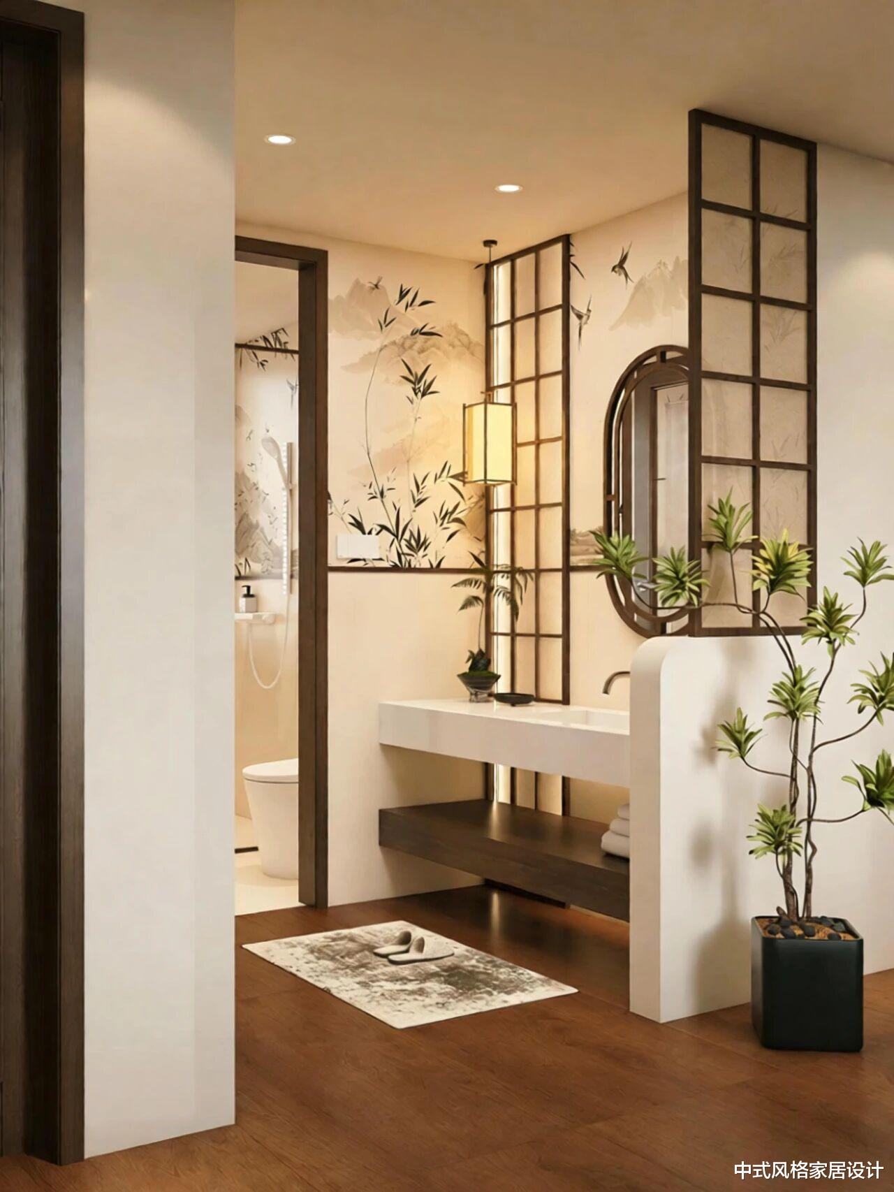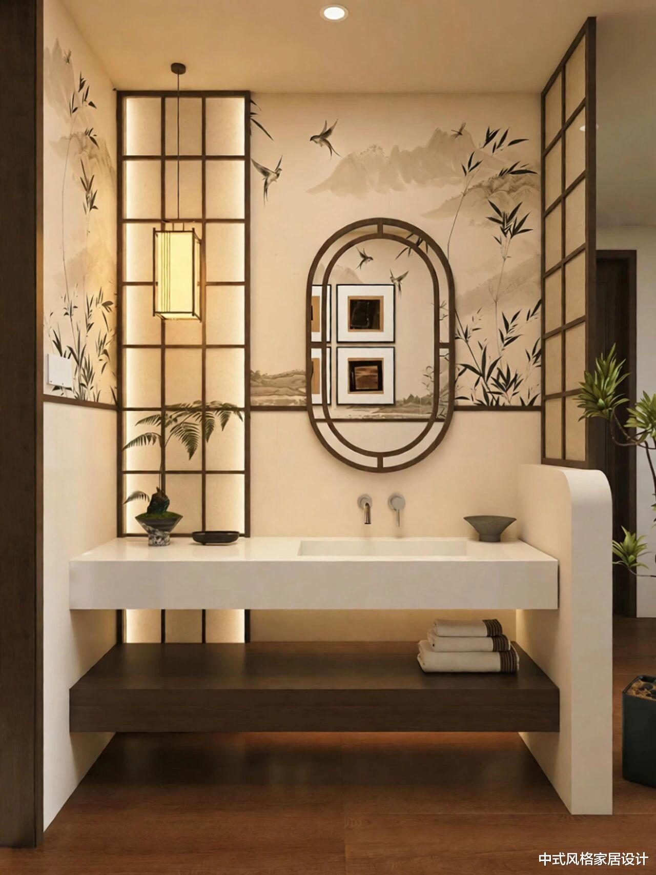 上下半墙的铺贴方式,不仅创造了视觉层次,更暗合了中国山水画中“远近高低各不同”的空间意识。在这个最功能化的空间里,文化意象以最艺术的方式呈现,让日常洗漱也成为一场美学体验。