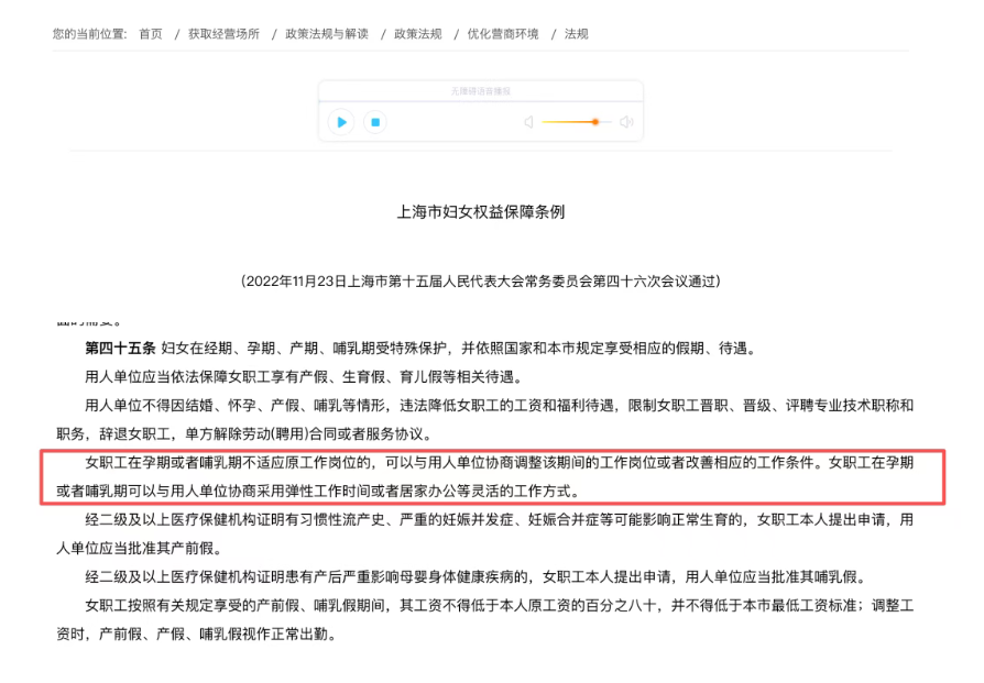 如上海市在《妇女权益保障条例》第四十五条中明确提到:孕期、哺乳期女职工可协商居家办公。