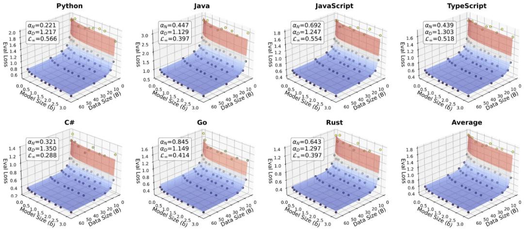 为了打破这一黑盒,研究团队耗费了相当于 33.6 万个 H800 GPU 时,进行了超过 1000 次实验。研究覆盖了从 0.2B 到 14B 的模型参数规模,以及高达 1T 的训练数据量,系统性地对 Python、Java、JavaScript、TypeScript、C#、Go、Rust 这七种主流语言进行了解构。这项工作的核心贡献在于建立了区分语言特性的 Scaling Laws,并据此提出了一套数学可解的最优数据配比方案。