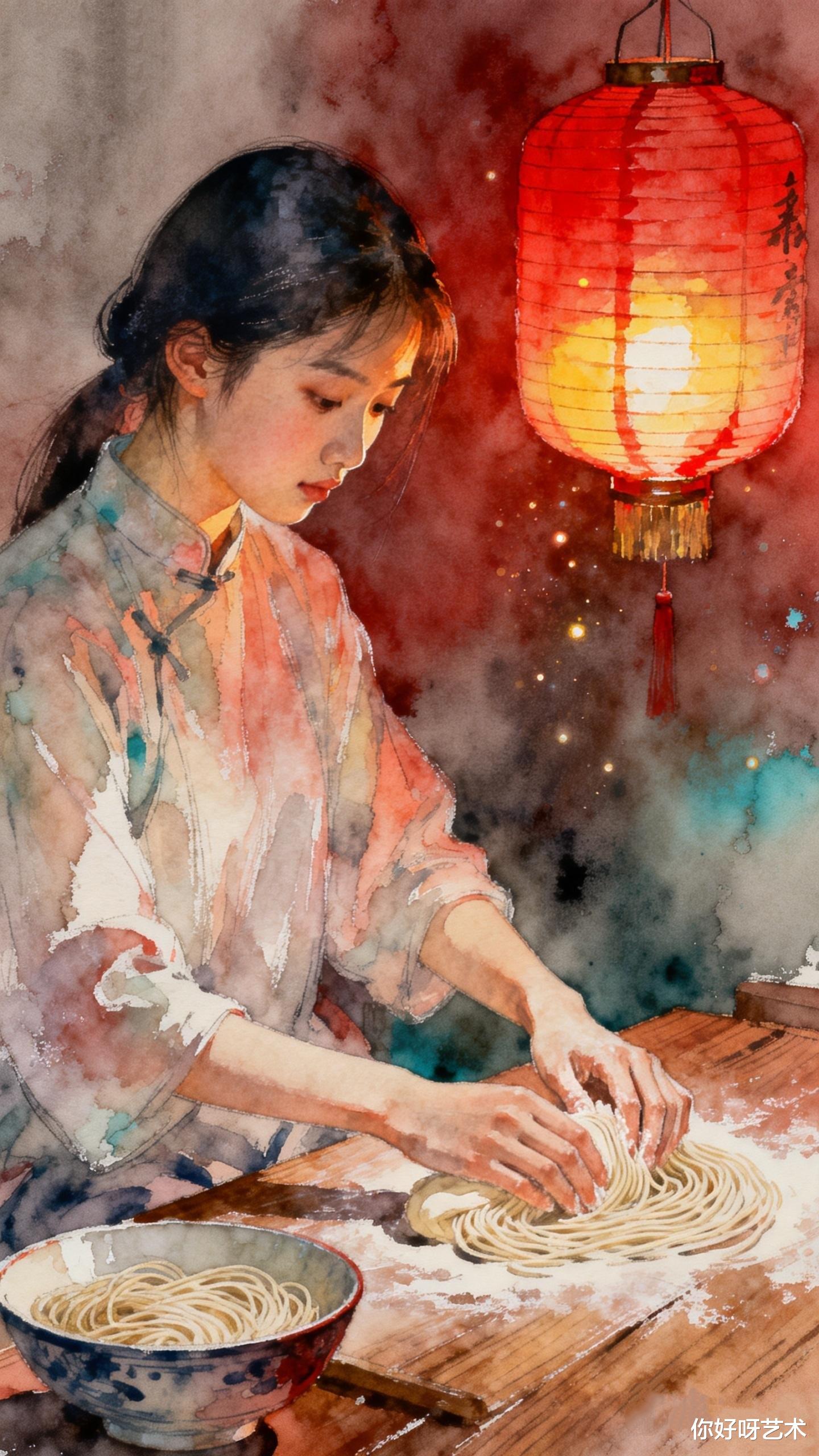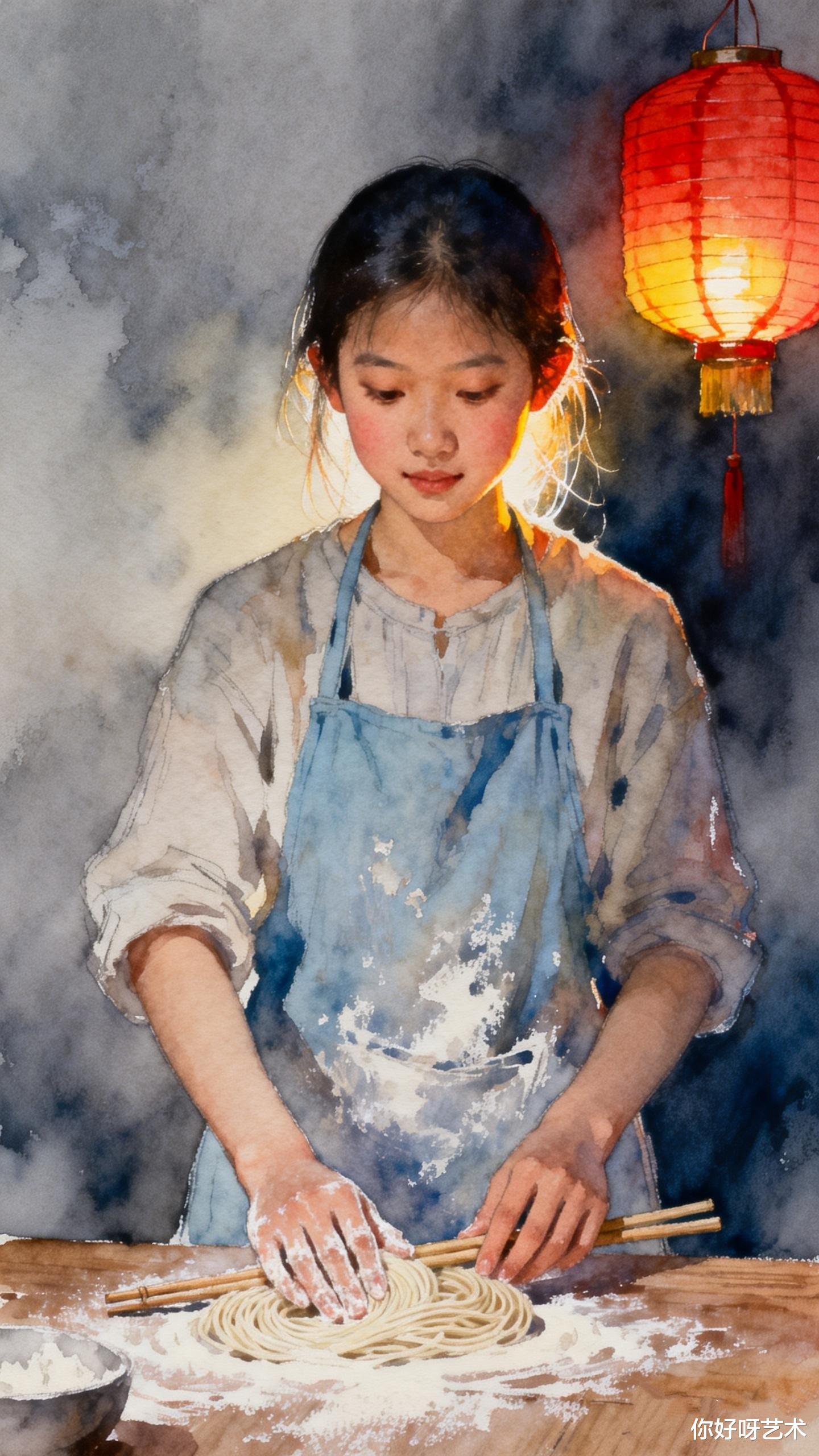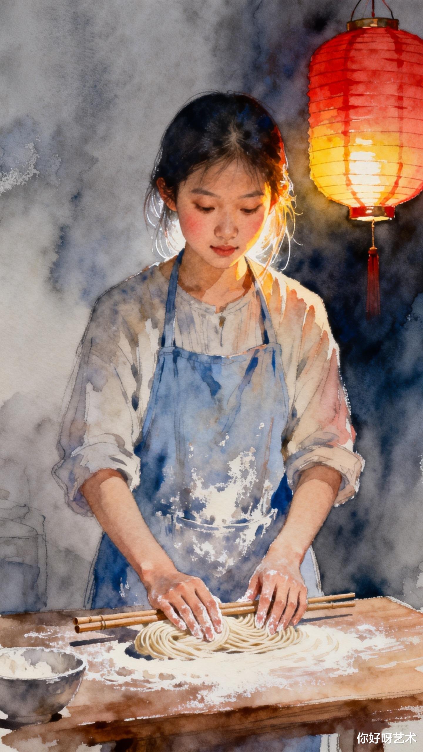 她先将面团擀成薄片,像展开一幅未完成的水彩画。面团在擀面杖下延展,如同山峦在晨光中舒展。她想起祖母的话:"长寿面要揉得透,擀得薄,切得细,煮得韧。"于是她将面团反复揉捏,直到面团变得光滑如玉,仿佛能映出她脸上的笑意。