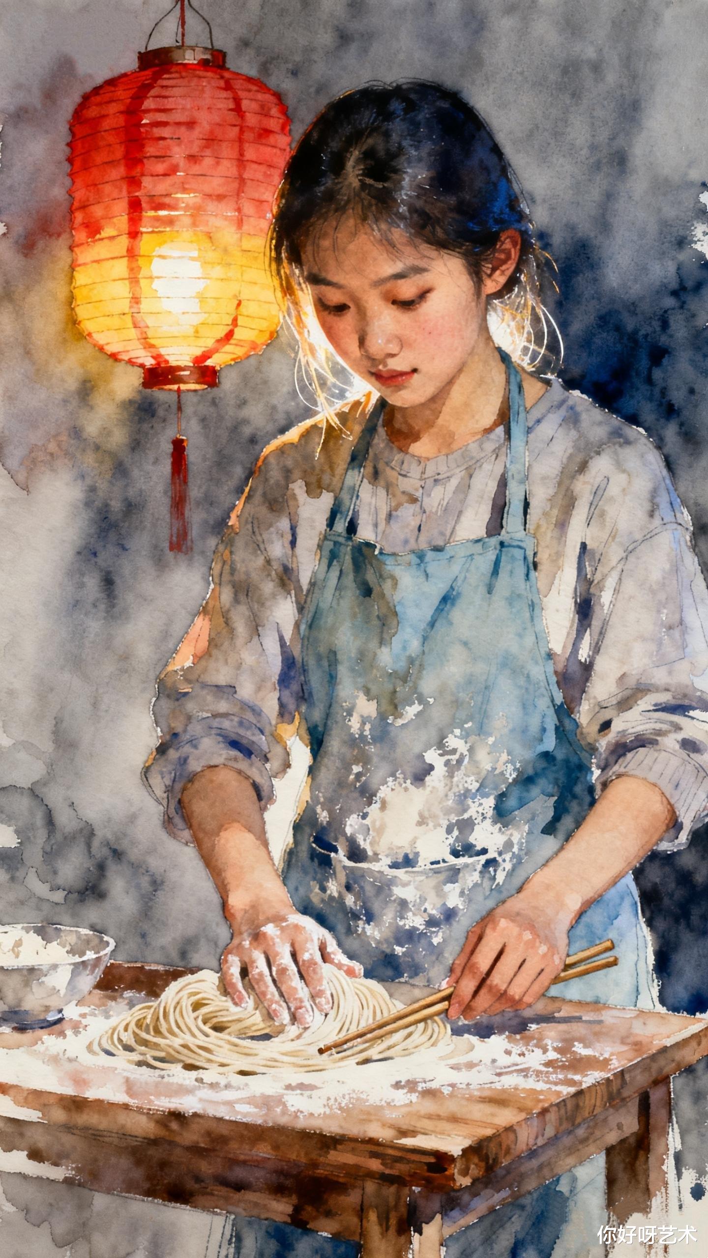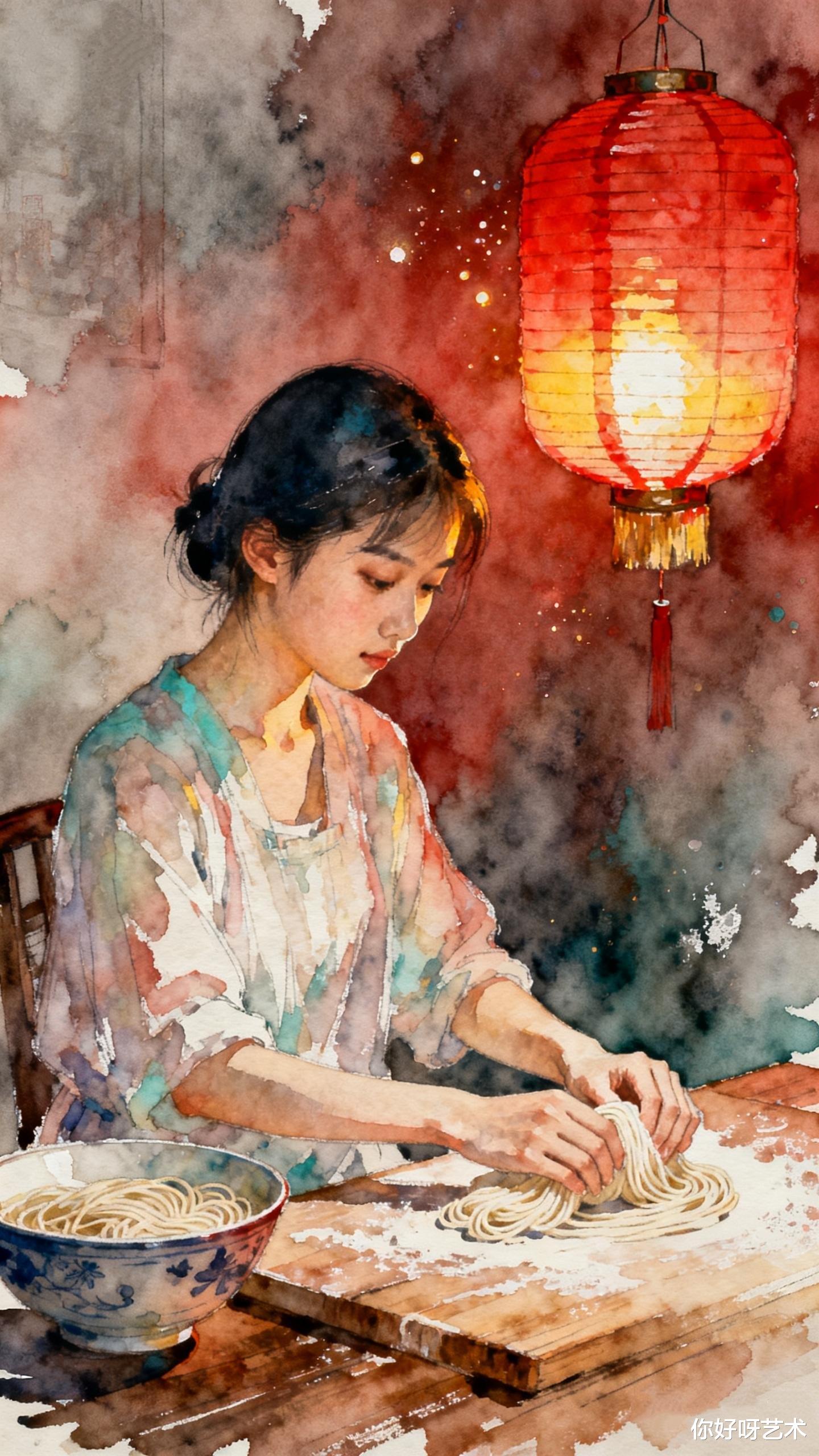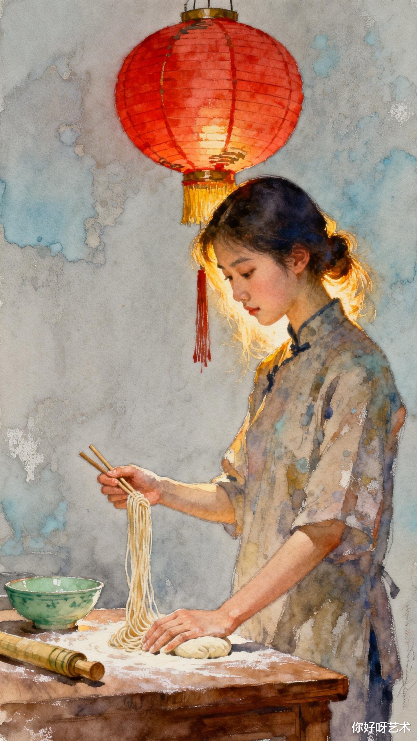 她先将面团擀成薄片,像展开一幅未完成的水彩画。面团在擀面杖下延展,如同山峦在晨光中舒展。她想起祖母的话:"长寿面要揉得透,擀得薄,切得细,煮得韧。"于是她将面团反复揉捏,直到面团变得光滑如玉,仿佛能映出她脸上的笑意。