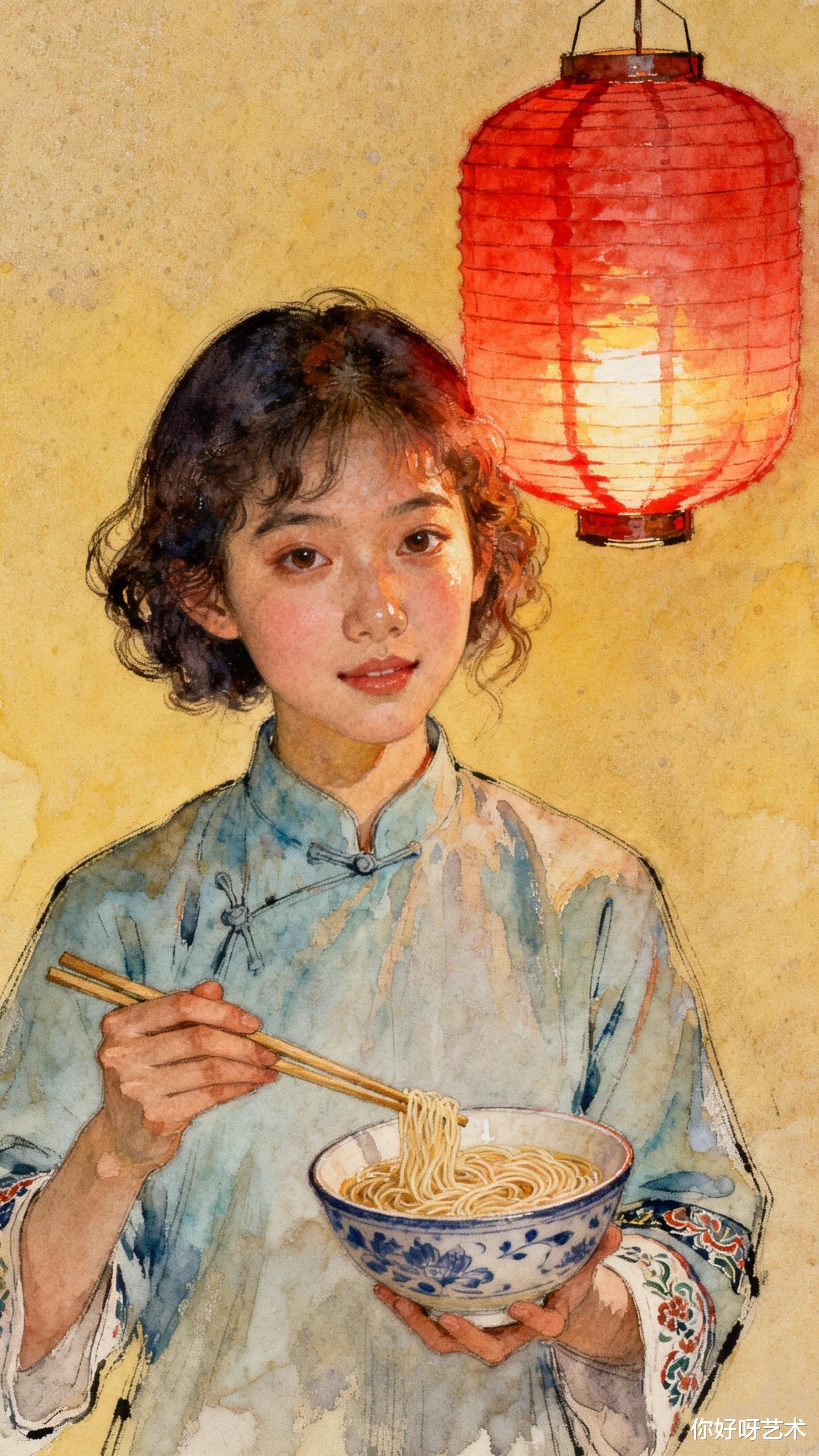 暮色四合时,面条已煮得透亮。少女将面条捞出,盛入青花瓷碗。她撒上葱花与虾皮,像在给水彩画添上最后的点睛之笔。热汤浇下,面条在碗中舒展,像一朵在水中绽放的花。她端着碗走到祖母面前:"阿嬷,吃长寿面了。"