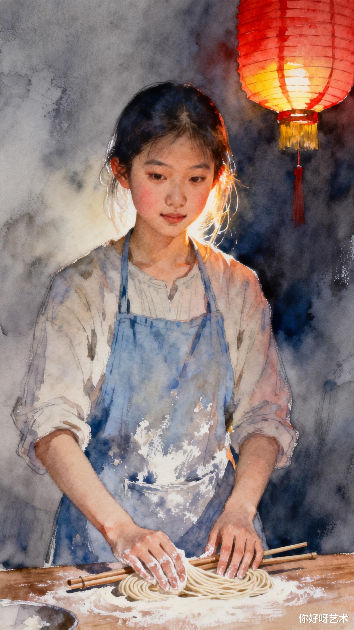 晨光初透时,厨房的窗棂已染上橘粉。正月初九的风裹着桂香,穿过少女的发梢,将她裙摆上的水彩颜料吹成一片流动的霞。她系着靛蓝围裙,在案板前揉着面团,指尖沾着面粉,在晨光里泛着珍珠般的光泽。案板上的面团像一片云,随着她的揉捏,渐渐有了筋骨与温度。