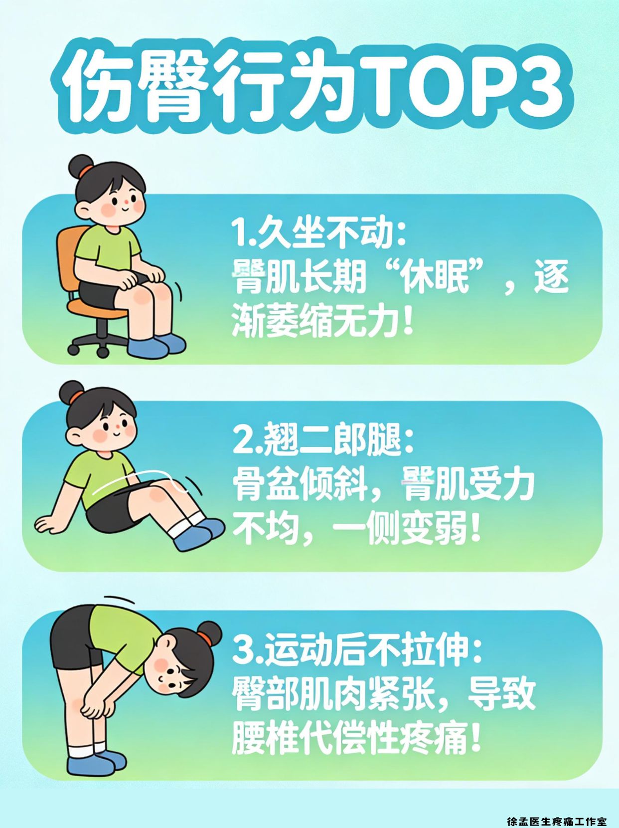 3⃣ 运动后不拉伸:臀部肌肉紧张,导致腰椎代偿性疼痛!