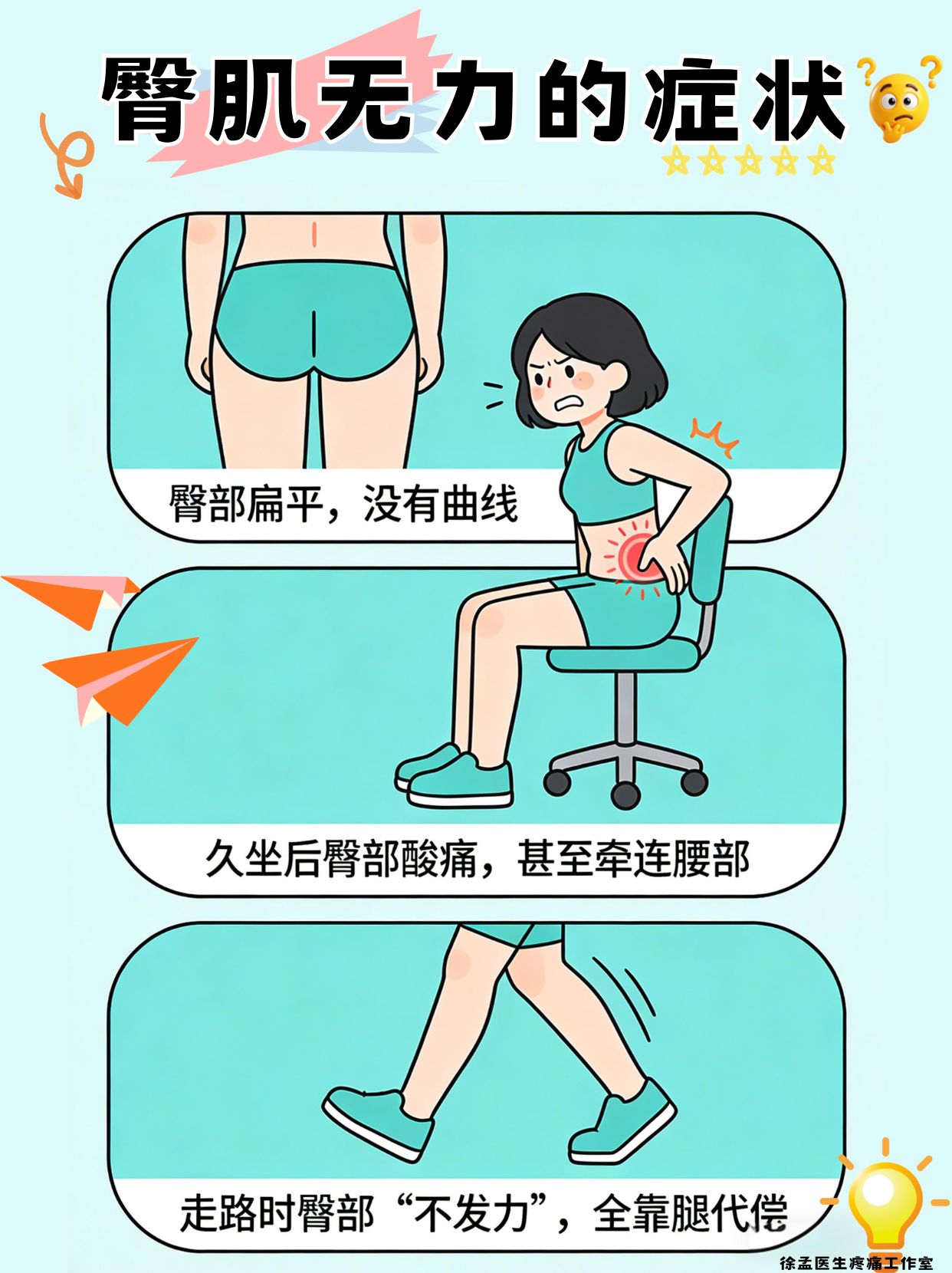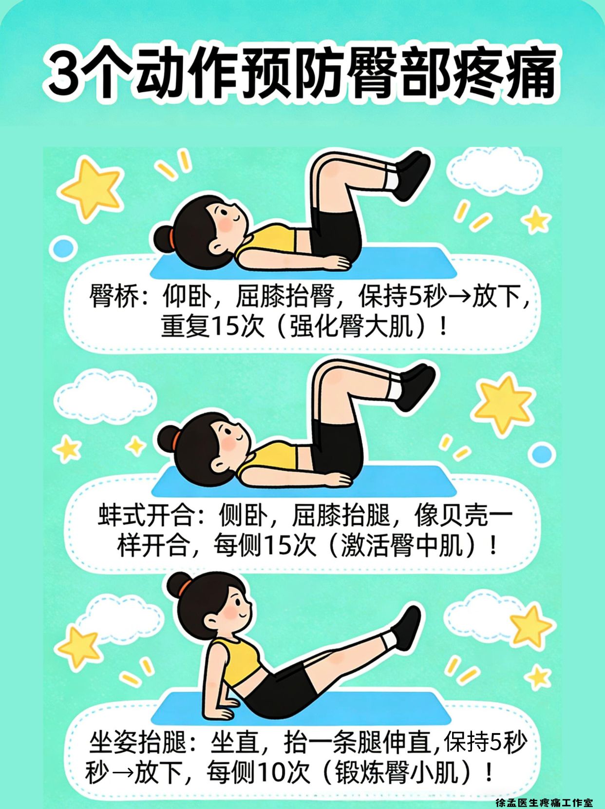 是不是总觉得臀部又扁又酸?久坐后屁股像‘坐塌’了一样? 别以为只是不好看!臀肌无力会导致腰椎压力倍增! 今天教你3个动作,锻炼臀部+保护腰椎!”
