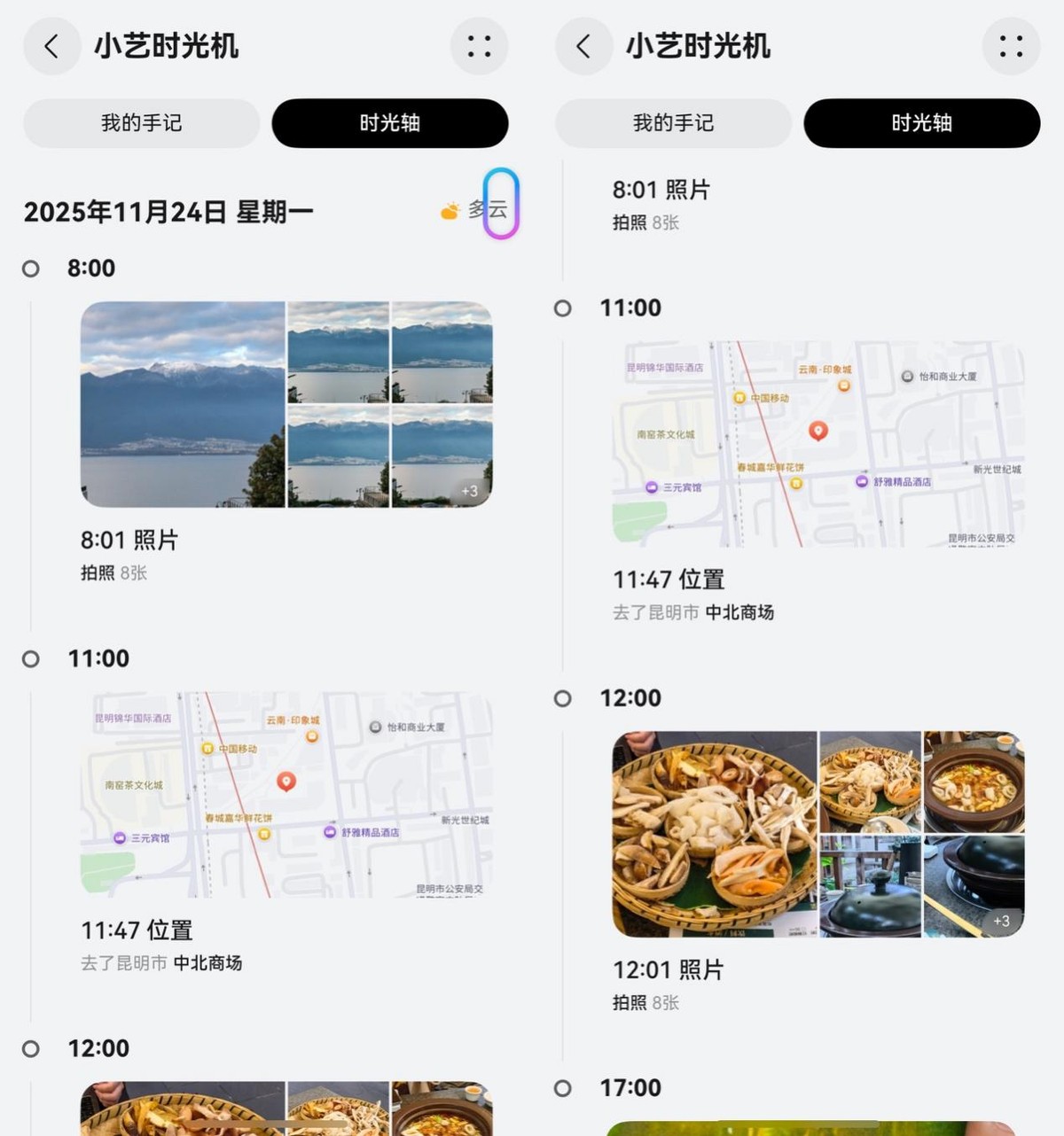 上周在昆明品尝了菌子火锅,尽管冬季不是菌子的应季时节,但那锅菌汤的鲜美直接封神。不管是牛肝菌的肥美、竹荪菌的独特口感还是见手青的鲜香,都让我大饱口福。随手拍了一堆照片打卡之后,小艺时光机自动就记录了当时的时间、地点,把相册里的照片整理得明明白白,还生成了一条时光轴,翻起来像在刷自己的“舌尖回忆录”。