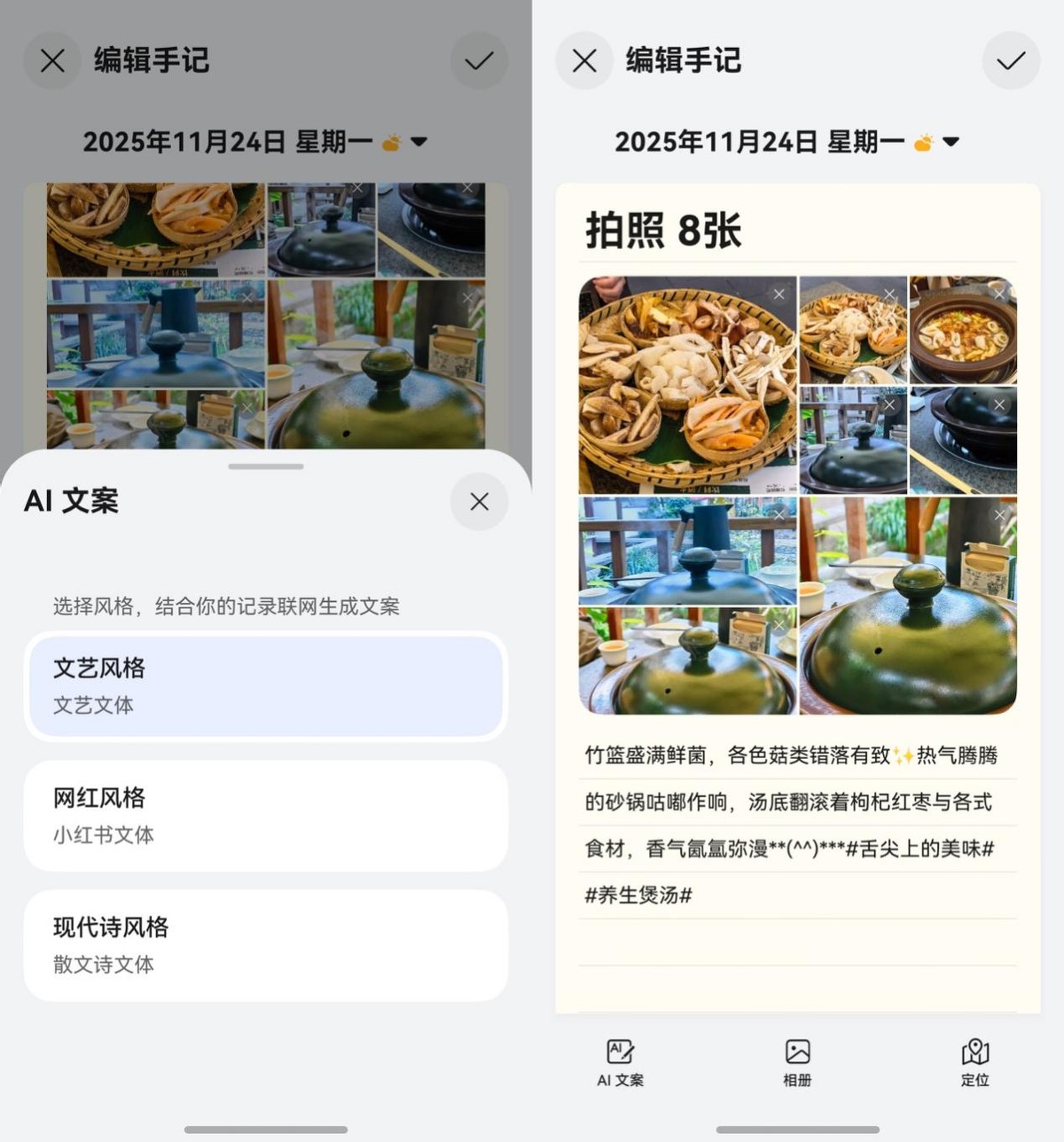 要是吃到特别惊艳的大餐,想写个手记,也不用我费心想词。小艺时光机的手记创作模式自带AI帮写功能,不仅能基于我的定位、照片和关键词由AI自动生成手记初稿,还能在文艺风格、小红书风格、现代诗风格之间自由选择。生成好的内容,还可以直接分享到微信、小红书等各个平台,懒人发圈再也不用绞尽脑汁想文案。