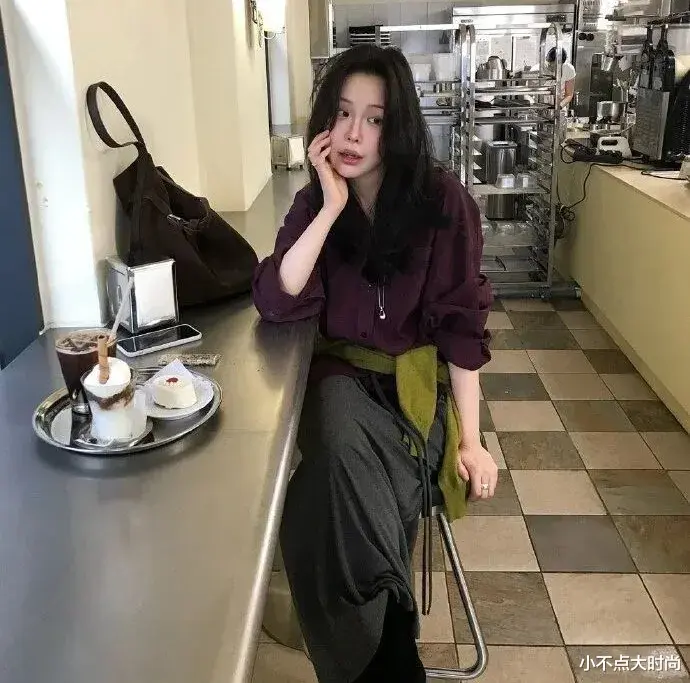 紫红色的衬衫搭配灰色的直筒裙,是一下班可以直接进咖啡馆的穿搭,干练和文艺切换自如。衬衫的微微宽松感增添松弛气息,腰间系一件复古绿针织衫,时髦复古,气质十足。▼