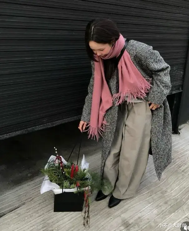 比如一条低饱和度粉色的围巾,轻松扫除深色大衣穿搭的沉闷和寡淡,瞬间有了温柔感,时尚又不落俗套,气质又高级。▼